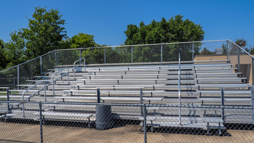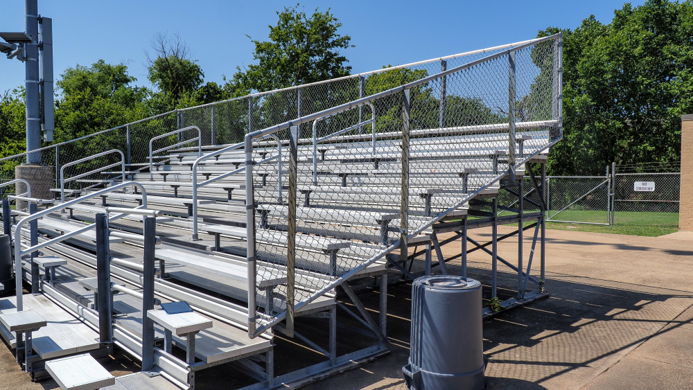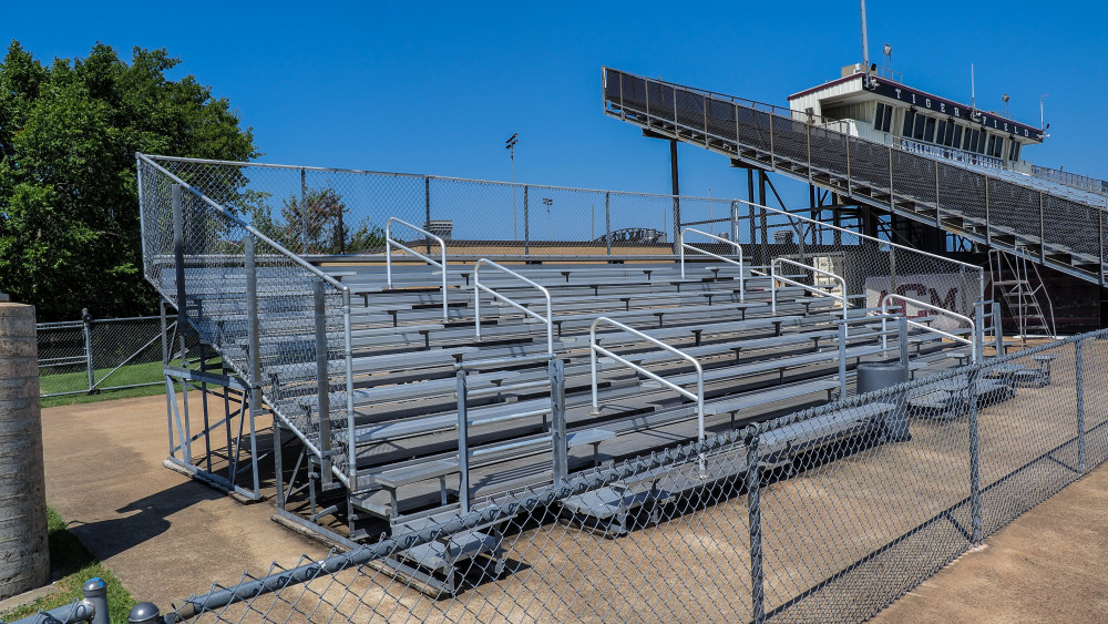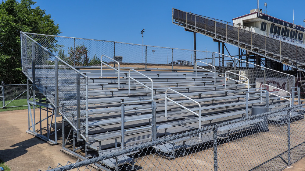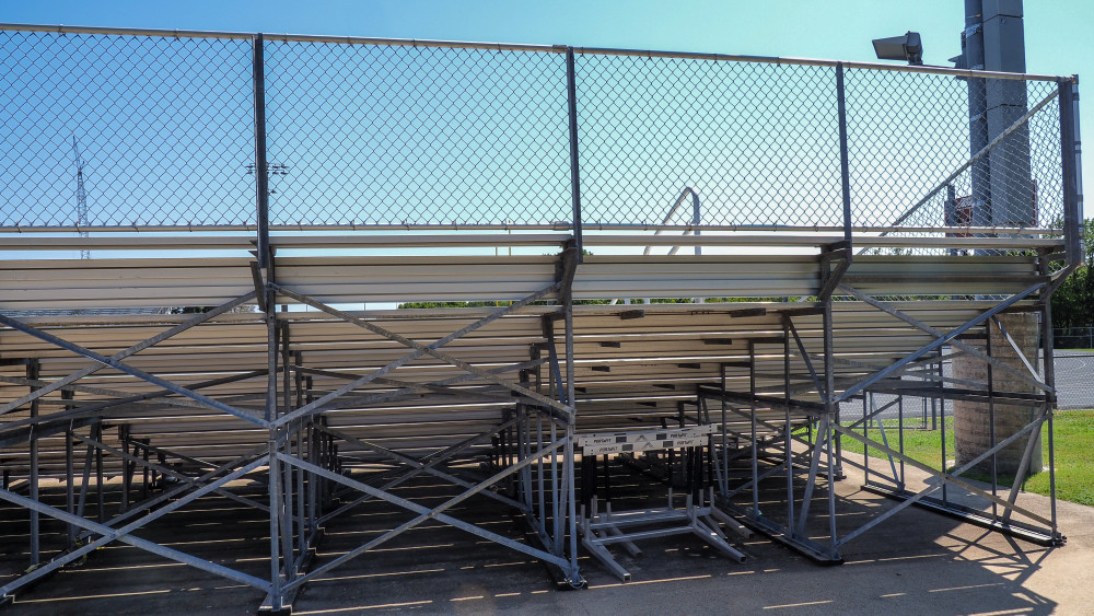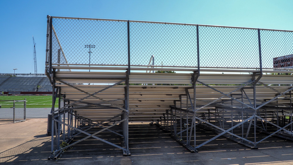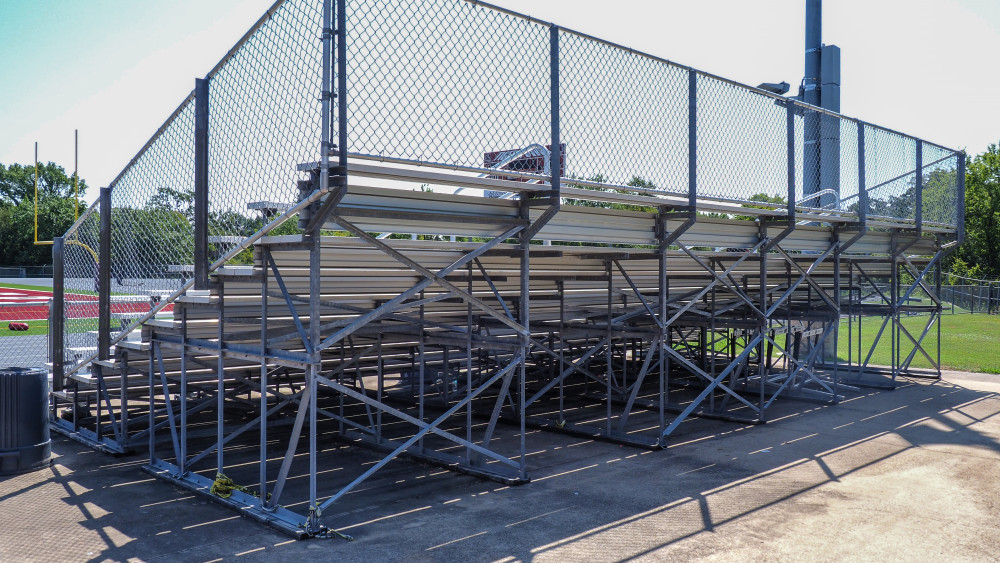 37’6” x 19’6” x 11’6” overall. 10 Rows of seats. Aluminum seats and foot board. Galvanized framing. Sitting on wood runners. Has hand rails, wheelchair cutout. Forklift assistance is available for loadout, but no help will be provided to dismantle the bleachers. ****Removal for these bleachers must be done between November 10th-14th due to end of football season, and construction starting