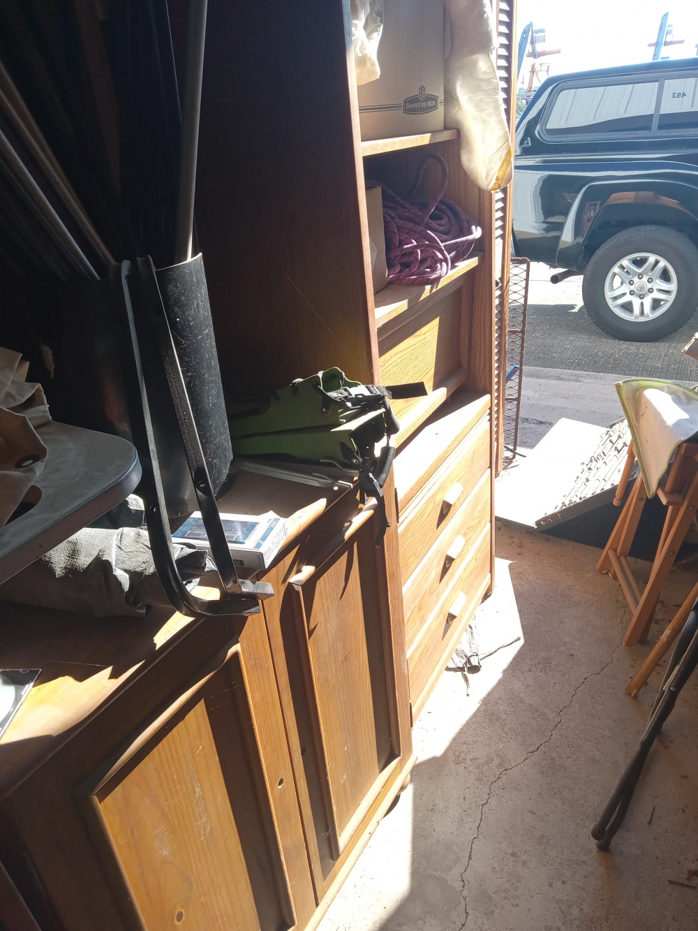 cancer forcing sale of estate. Several modern dressers with mirrors, modern chairs, folding padded wooden chairs, tools, camping gear, coleman lanterns and stoves, very large tents. antique metal wagon wheels, tools, plastic ponds, vertical dresser with fold out desk, stereo cabinets, standing wood shelves with doors, aquariums, and much more. wooden shelving is screwed together for easy disassembly. Pics soon
