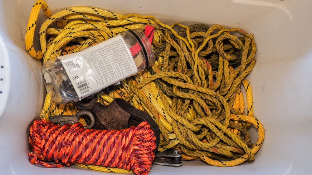Includes 2 inch ratchet strap. Various styles of ropes. Rope pulleys and some bungee cords.