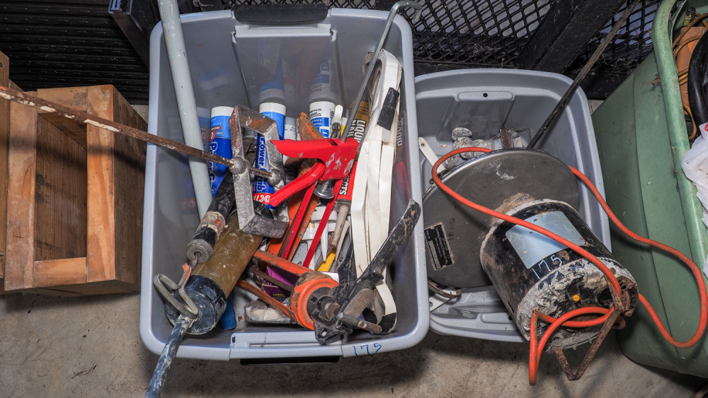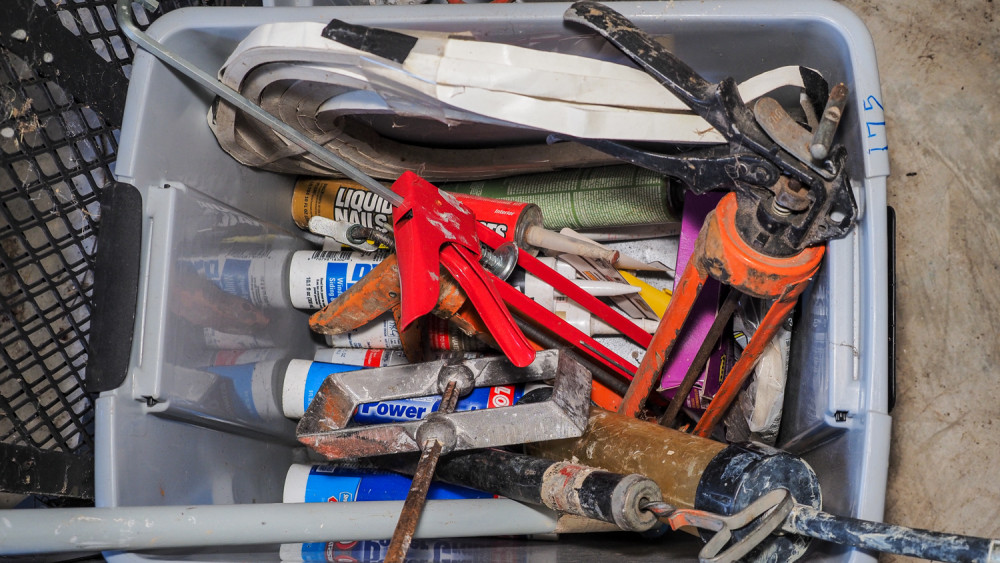 Includes Mud mixing paddle, caulk guns, . Liquid nails, caulk, . Brush rollers. Cleaners, . Extension handle, . Paint mixer