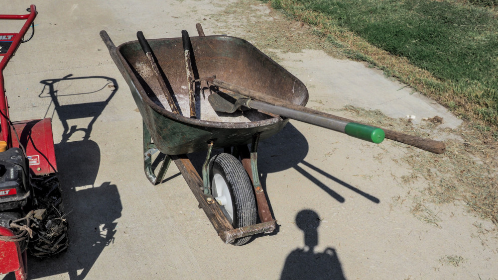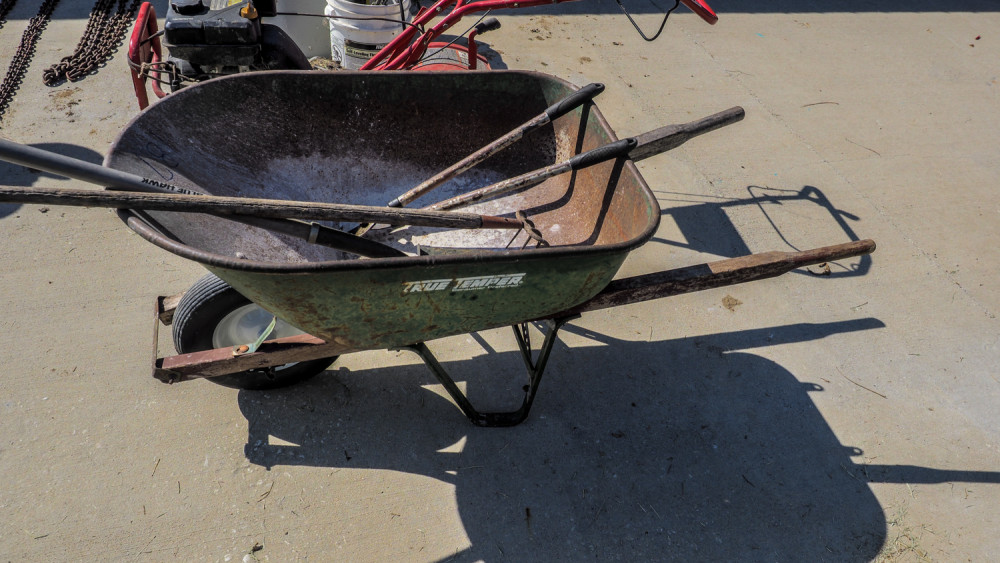 True temper wheelbarrow with Shovel, steel rake, limb trimmer.