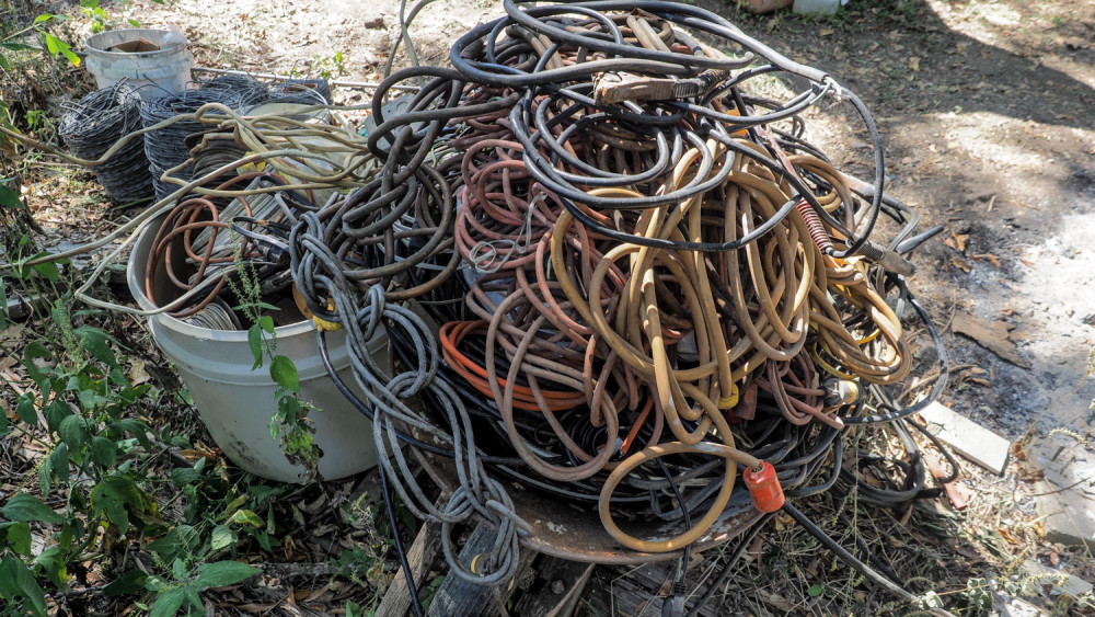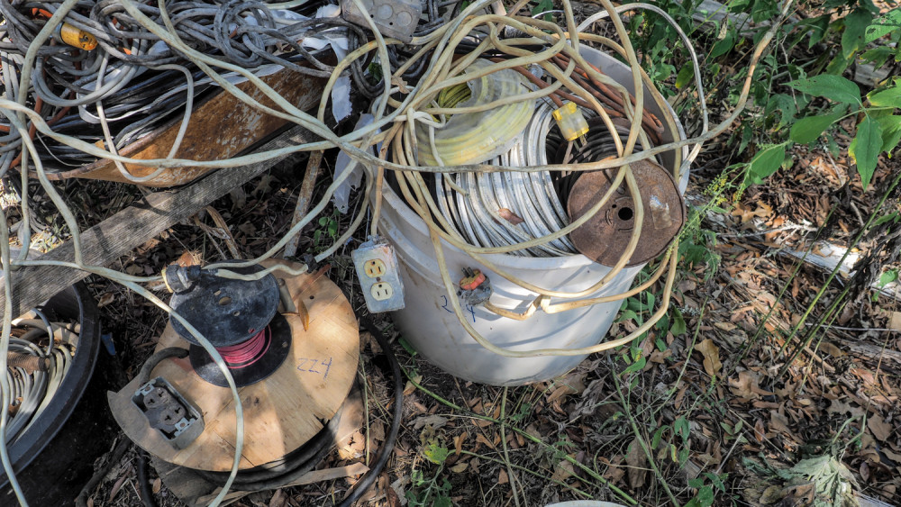 There's a large lot of electrical wire. All different types of wire including RoMex overhead supply wire, electrical cords, extension cords, jumper cables. Appliance cords. Oh Wheelbarrow is included.