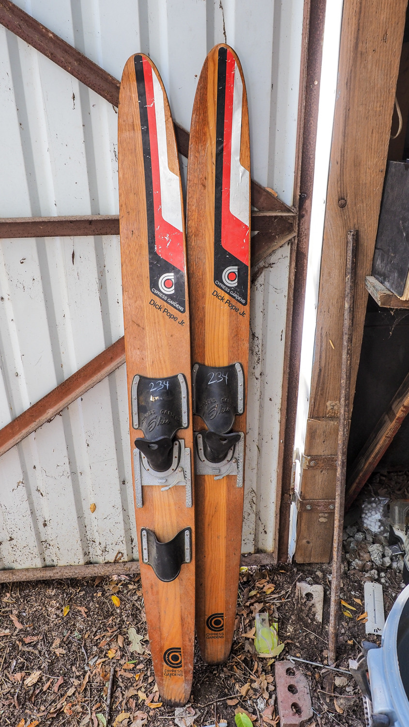 Pair of Cypress Gardens, Dick Pope Junior wood water skis. One ski is missing the tail fin