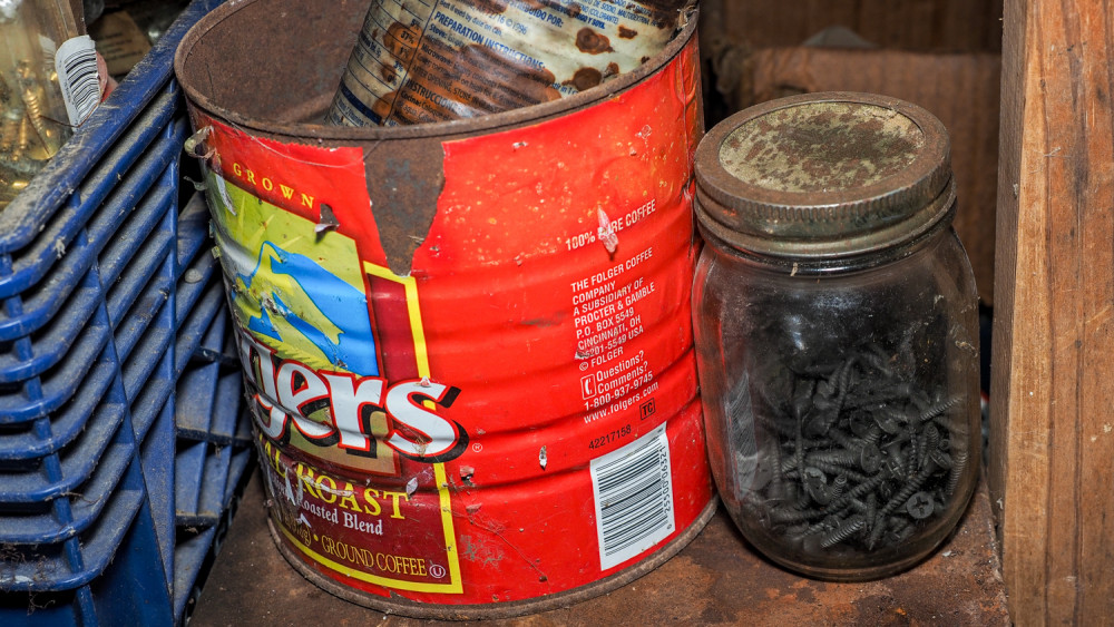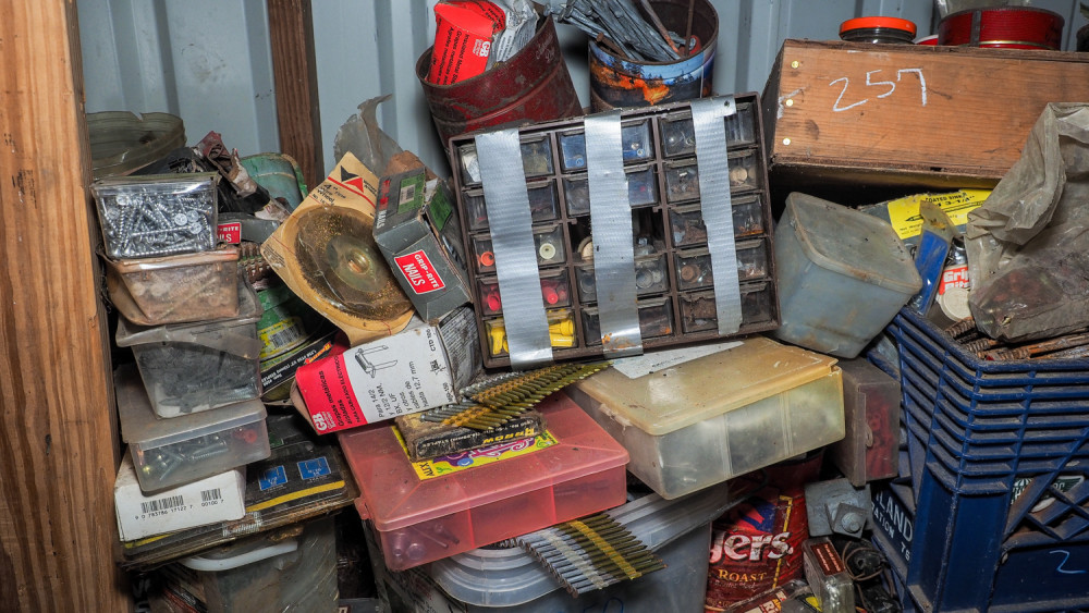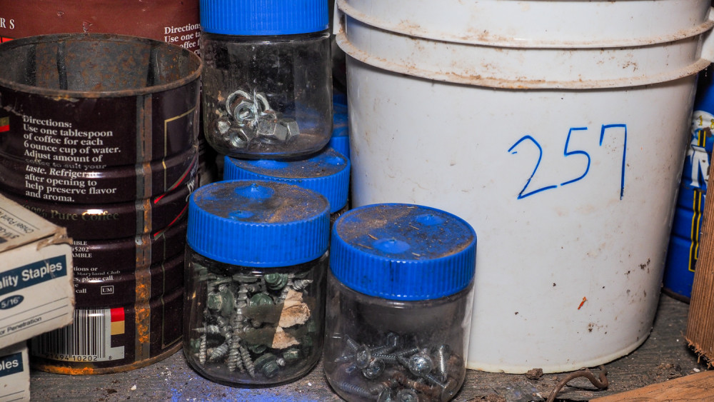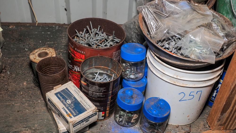 Shelf of fasteners. Includes nails, screws, drywall screws, rivets, self tapping screws.