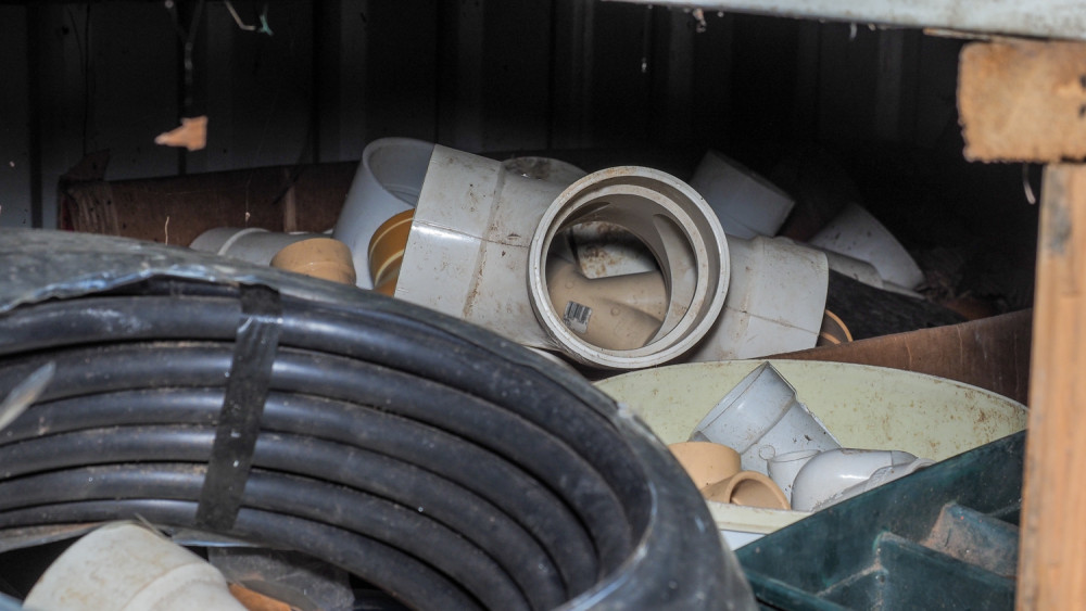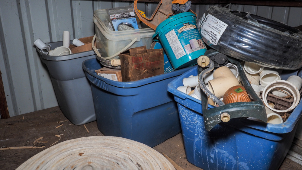 7 boxes and buckets of plumbing supplies. Includes PVC pipes, PVC pipe joints. Copper Fittings plumbing, hardware, garden hose fittings. Coming, , sink fixtures. And more
