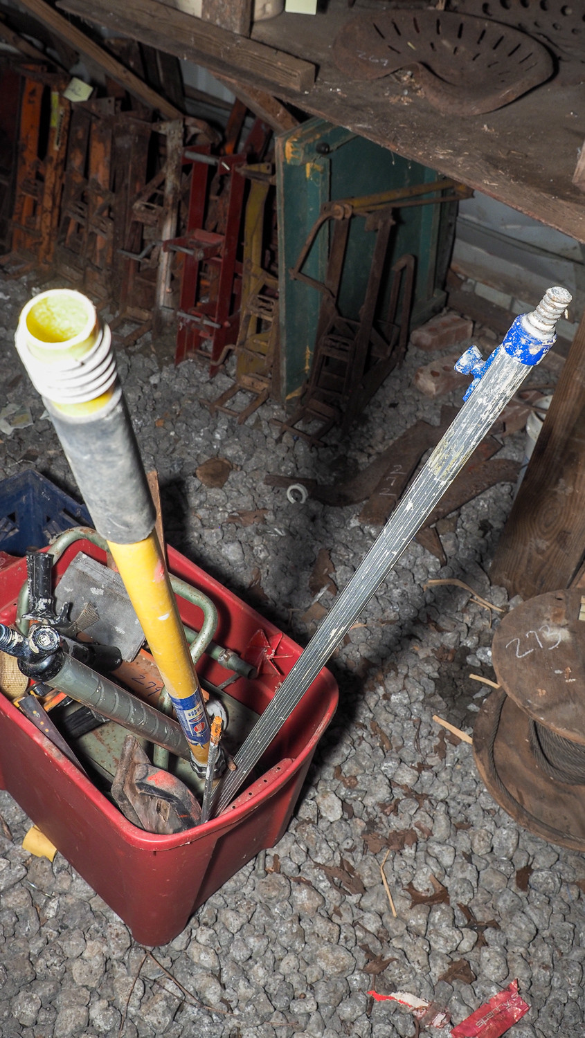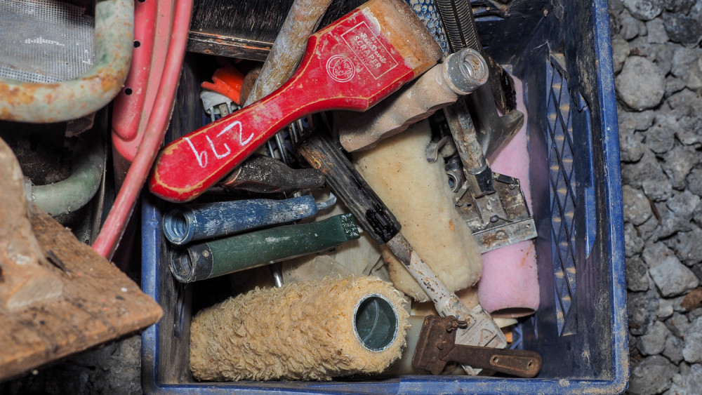 Painting tools and supplies. Includes extension handles, paint roller handles, drywall tape gun, masking tape gun, sanding handles, paintbrushes, wall scrapers, and more.