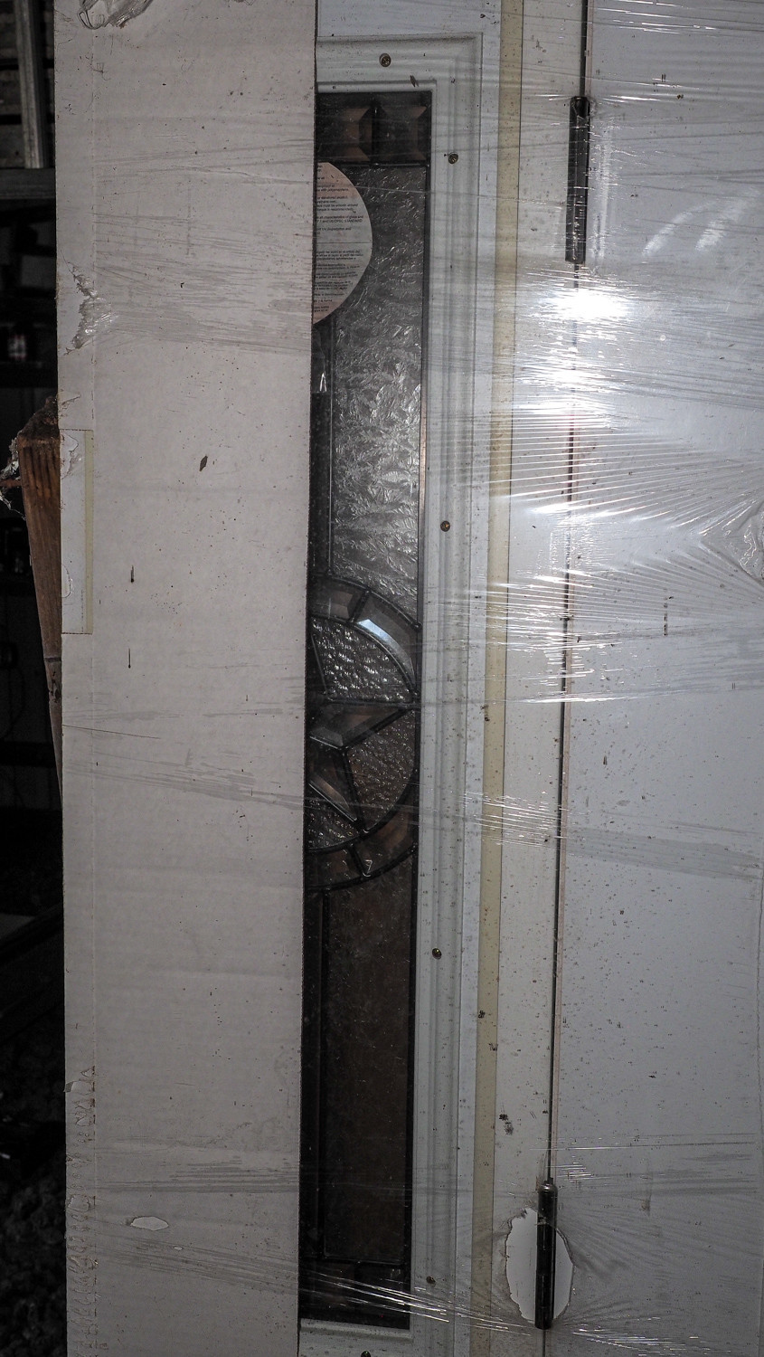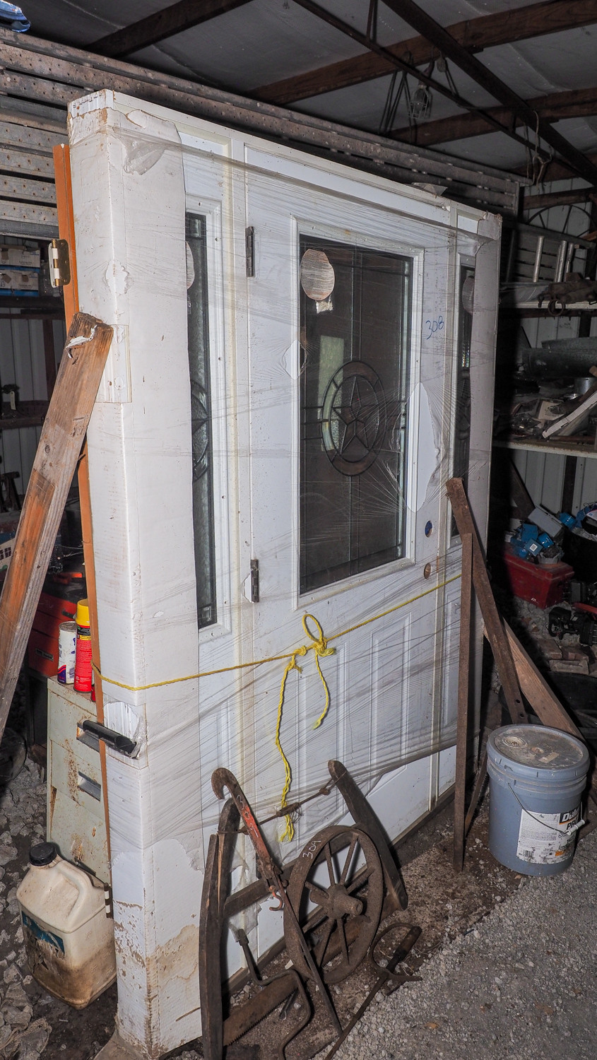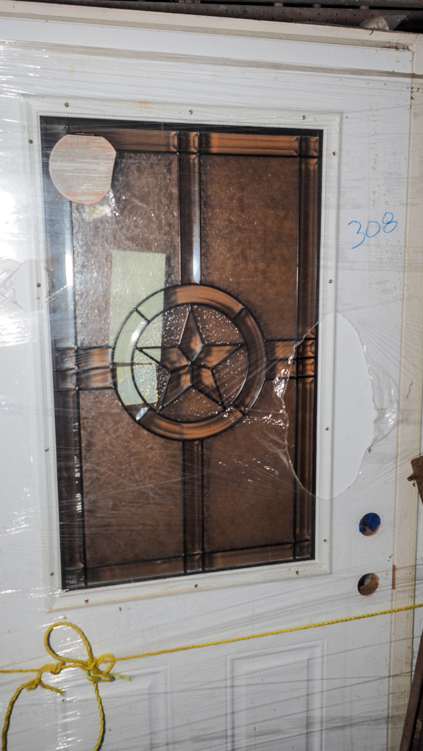 Lowe's metal clad front door with glass insert and glass satellite windows. Rough end opening is. 64.5 x 82 inches. All the windows have a Texas star pattern in them.