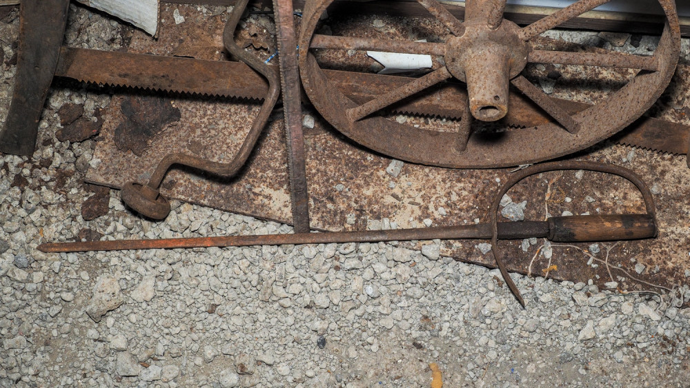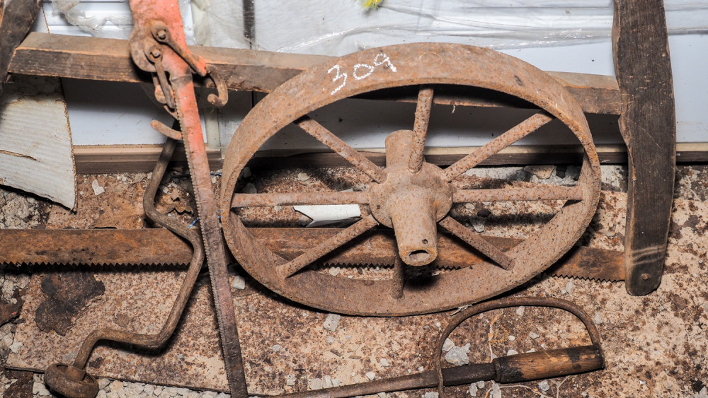 Includes cotton scale, 15 inch steel wheel, Buck Bow saw, hand forged sword