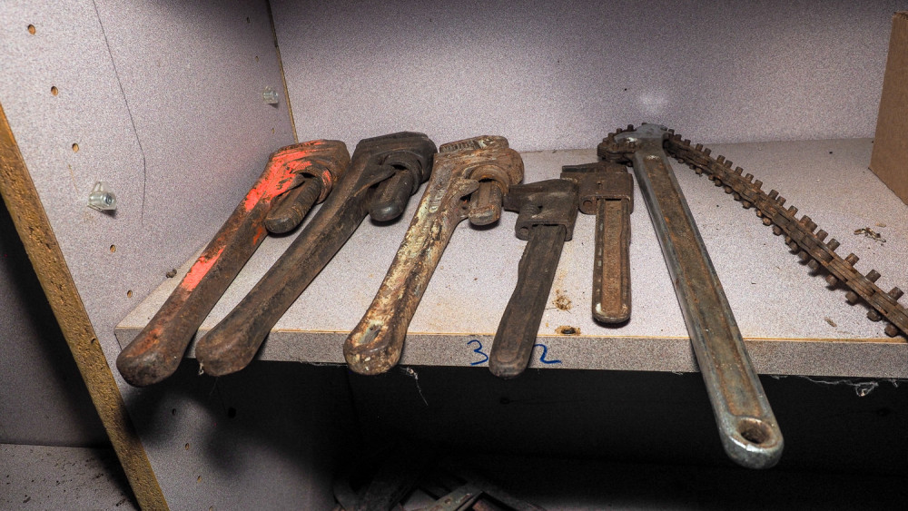 6 pipe wrenches. Includes pipe wrenches, monkey wrenches, and chain wrench.