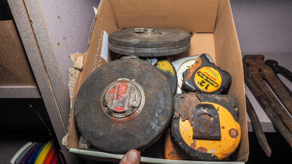 Box of tape measures including 100 ft steel tapes (#353) Estate Auction