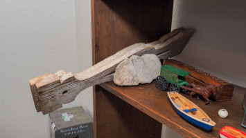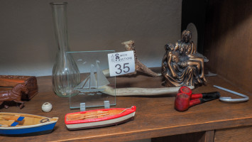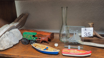 Bookends, white-tailed deer horn, pipes, wood boats, cast-iron wagon, vase, rock, and more