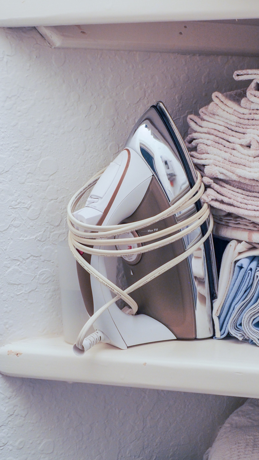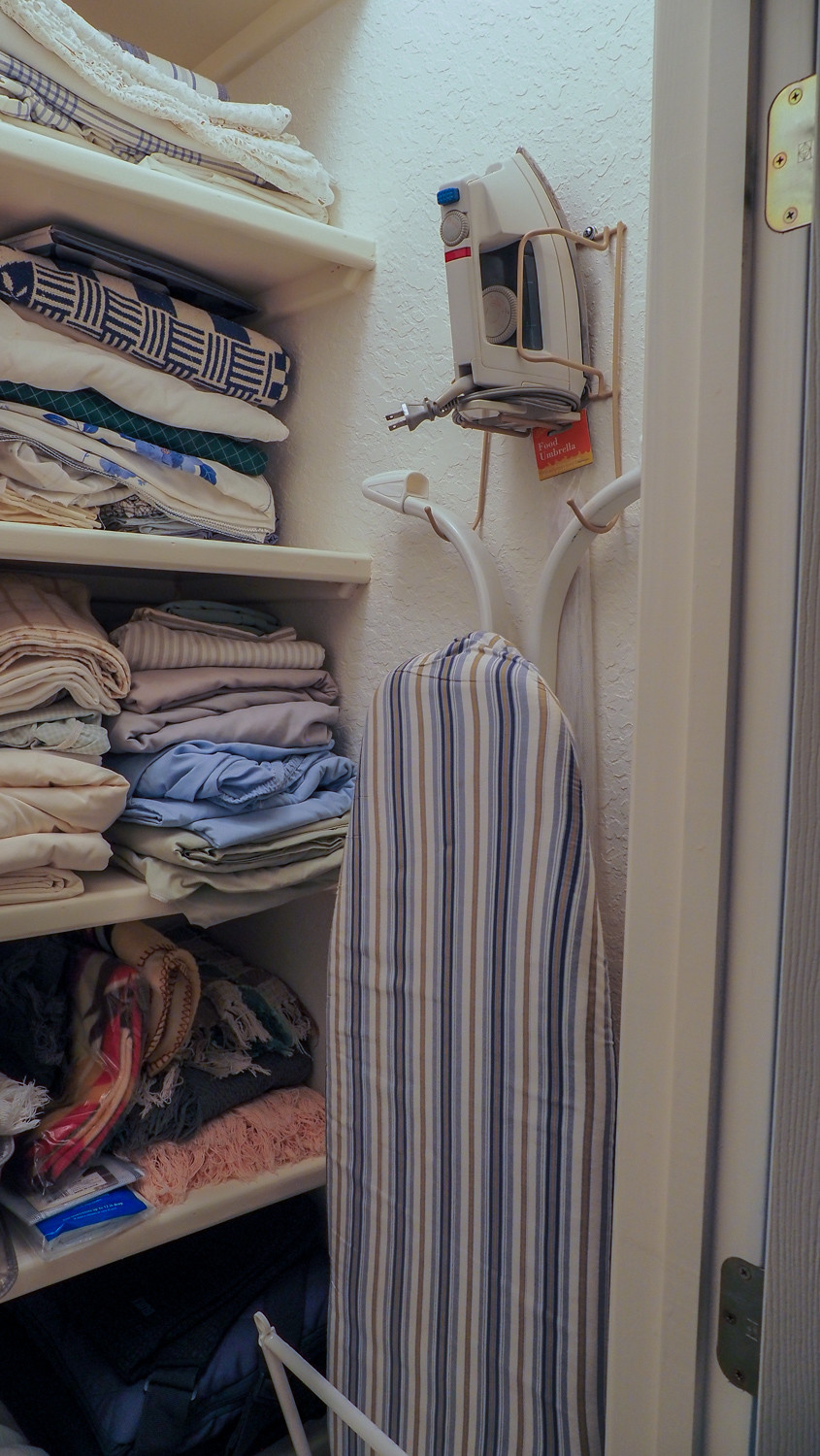 Bed linens, blankets, kitchen linens, ironing board, irons