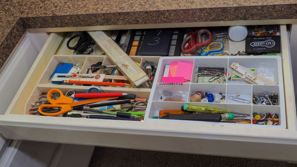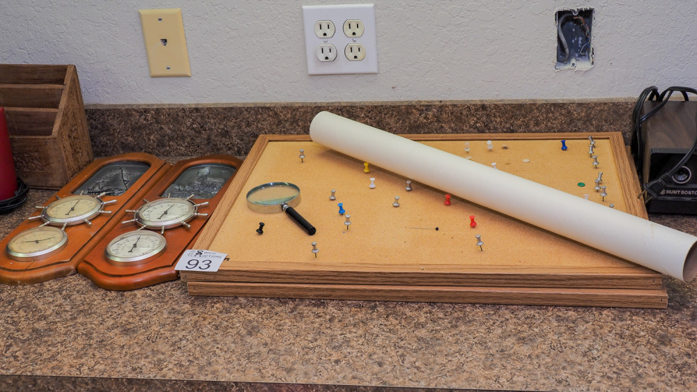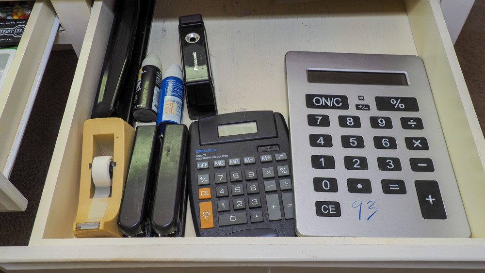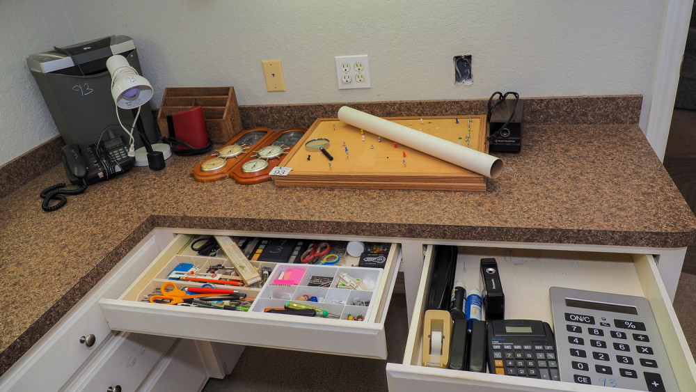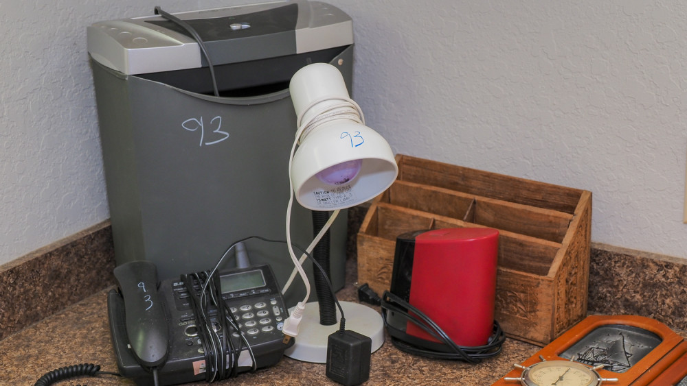 Pencil sharpener, tack boards, thermometers, wood organizers, desk lamp, telephone, paper shredder, pens, pencils, calculators, scissors, tape dispensers, hole punches, and more
