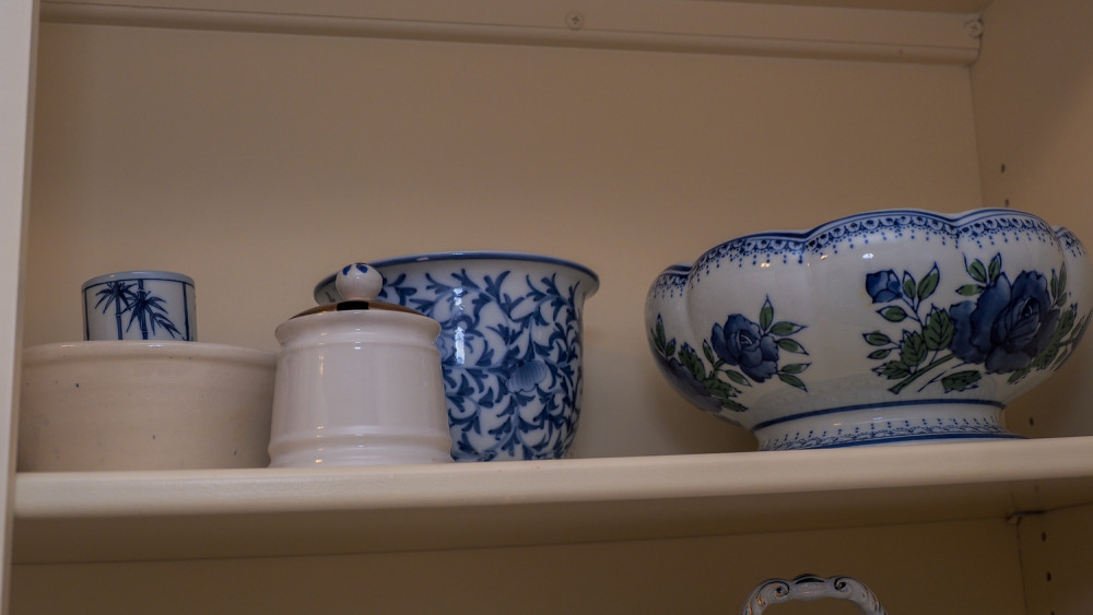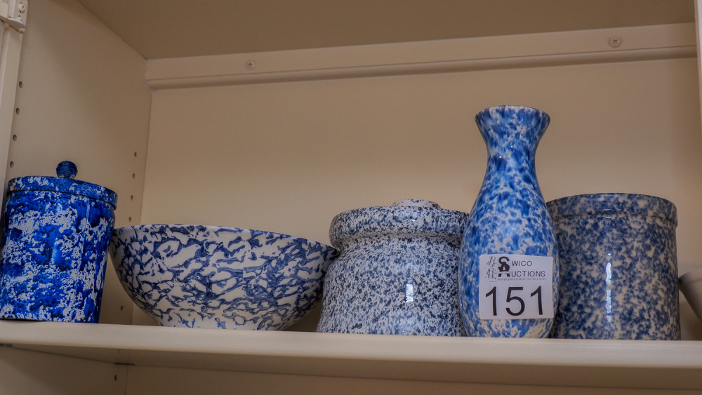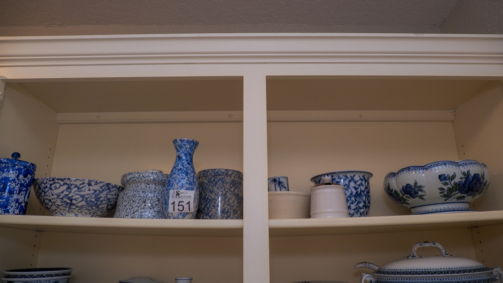 Shelf of blue & white dishes (#151) Kelley Moving Auction
