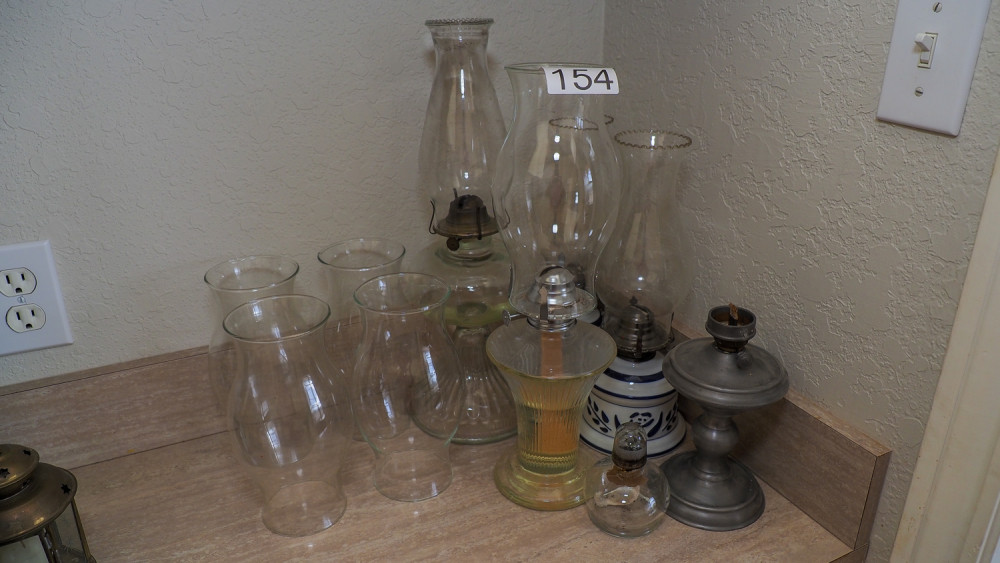 (6) Oil lamps with extra globes (#154) Kelley Moving Auction