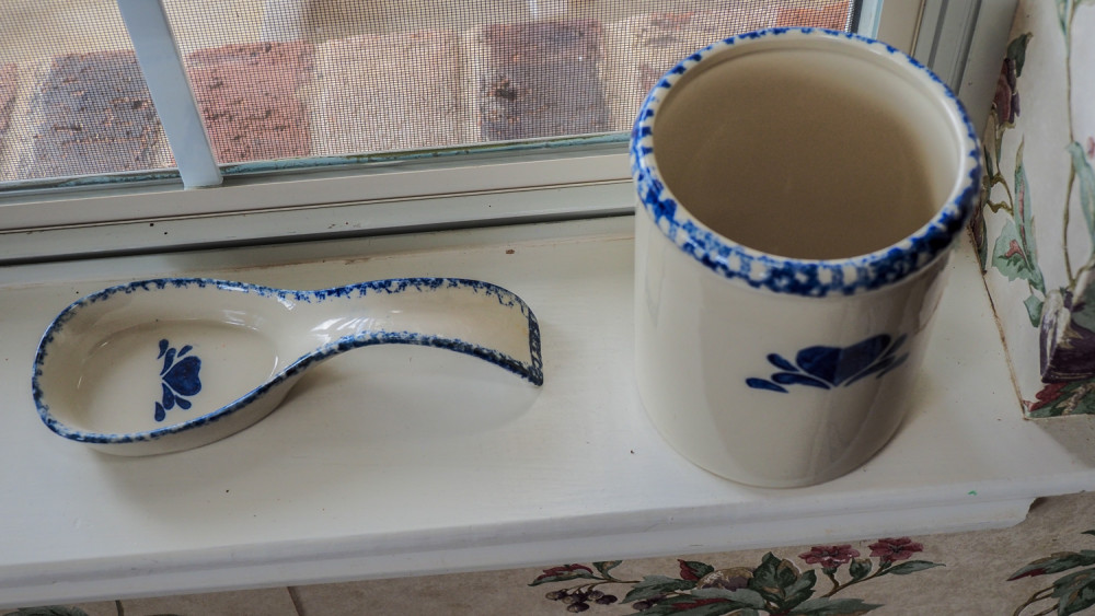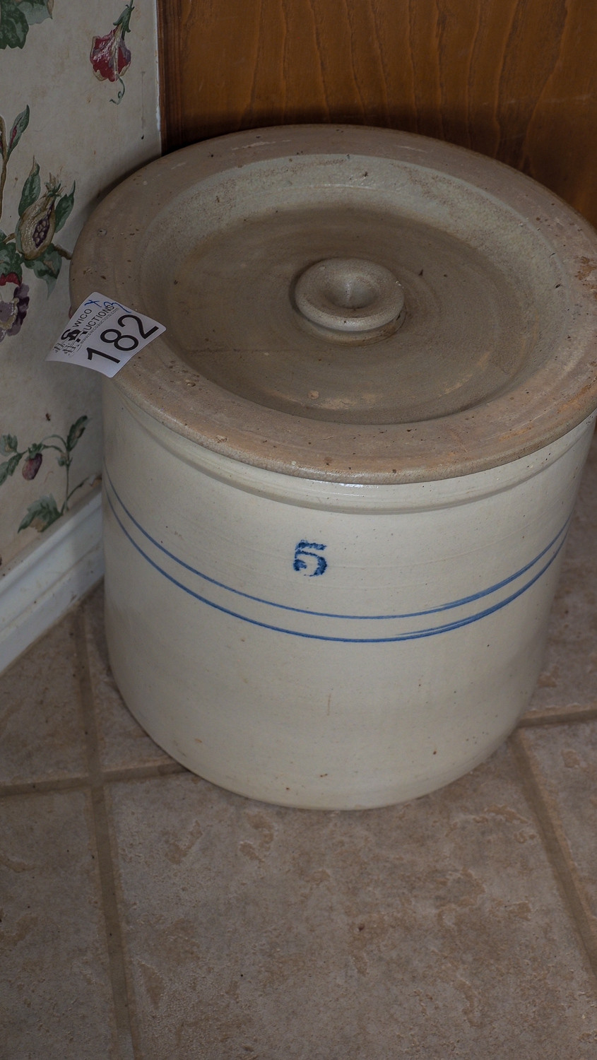 #5 crock with lid, small crock, ladle holder