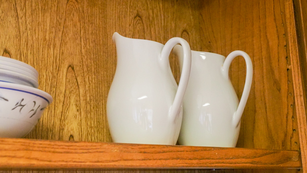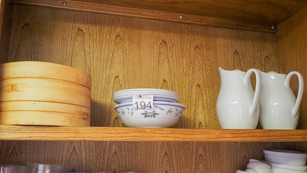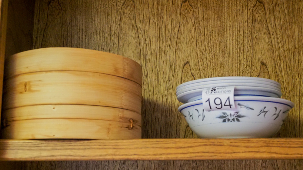Melamine plates, bamboo steam baskets, ceramic pitchers