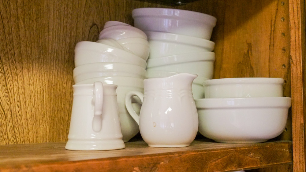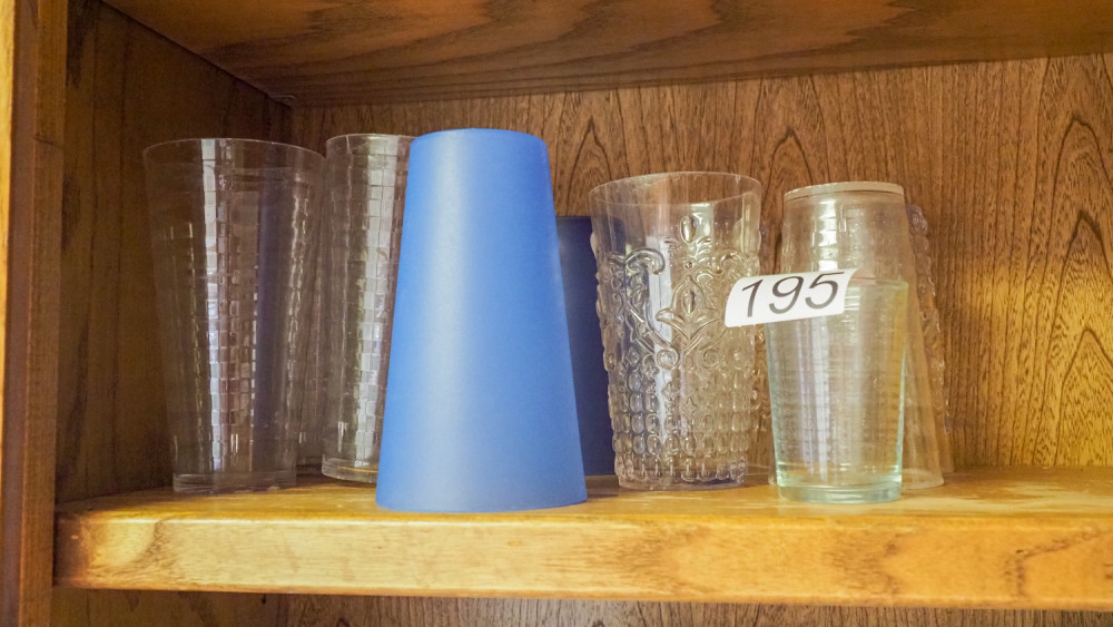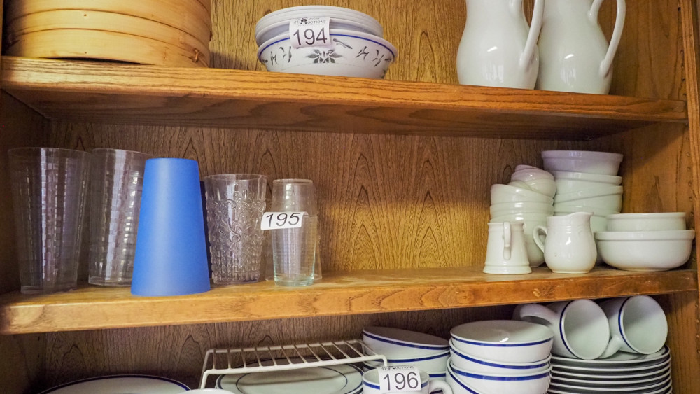 Shelf of plastic glasses & white dishes (#195) Kelley Moving Auction