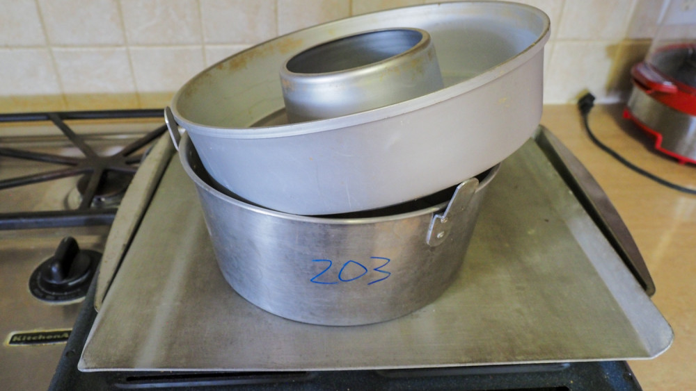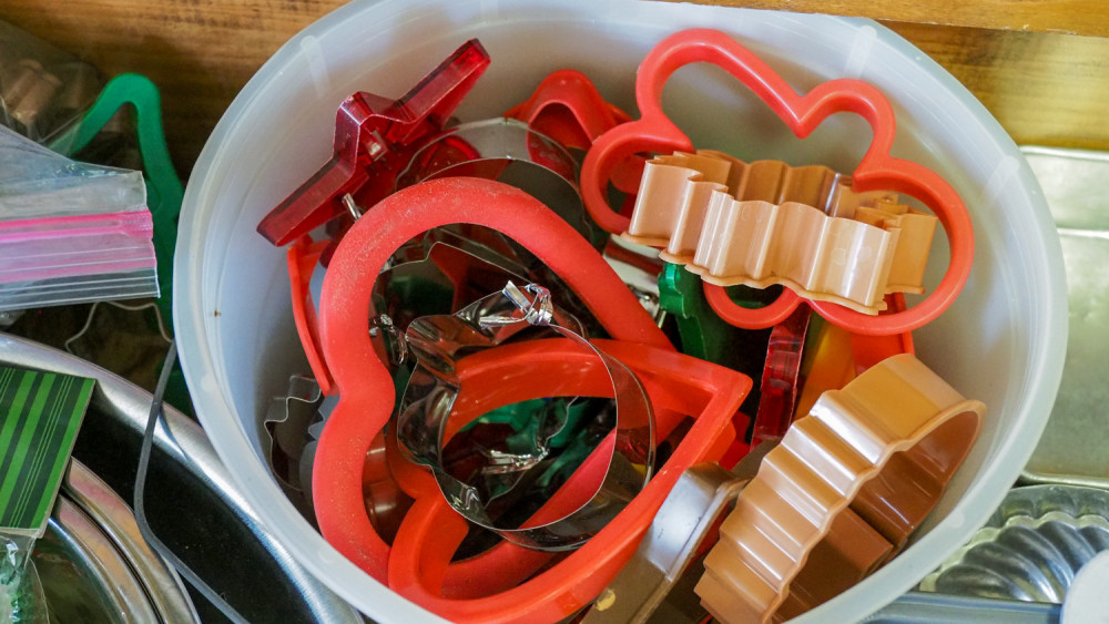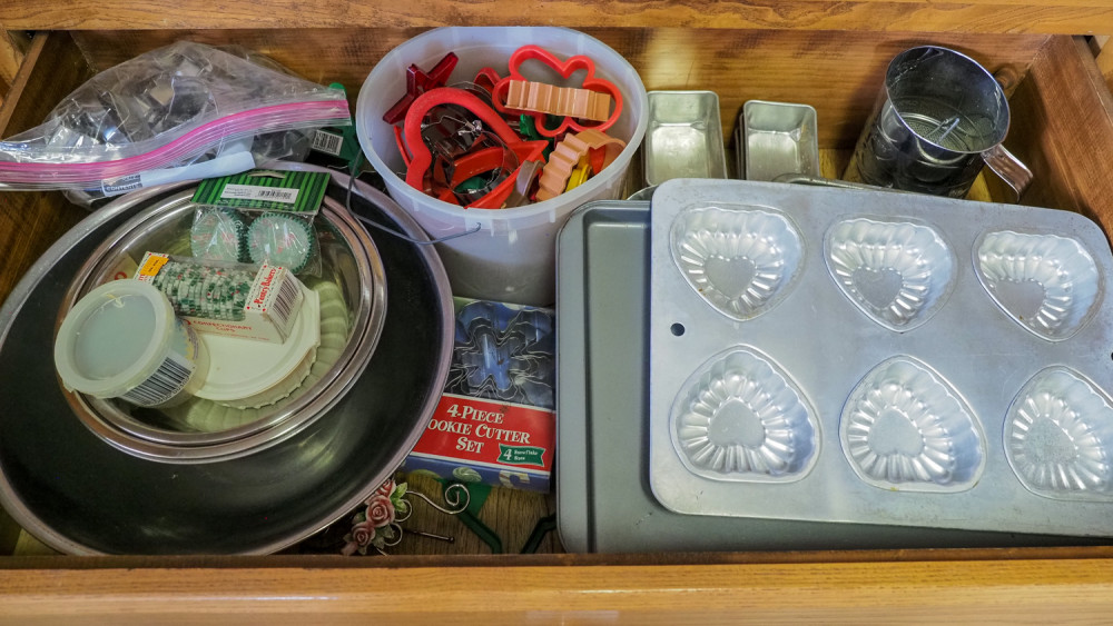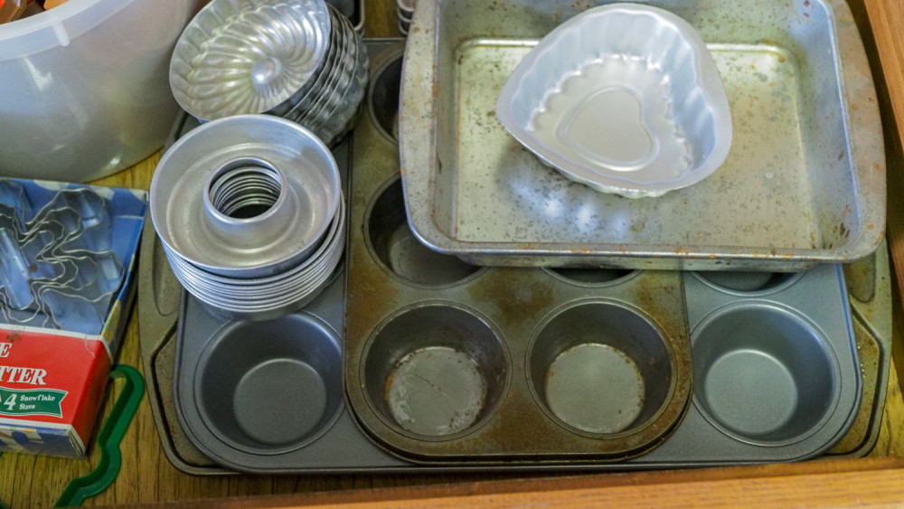 Stainless mixing bowls, muffin tins, cookie cutters, mini loaf pans, sifter, bundt pans