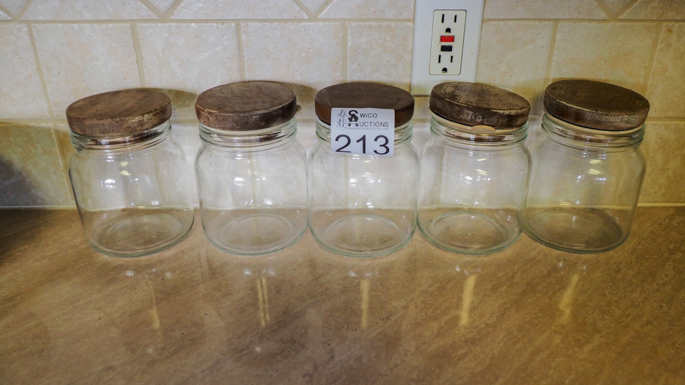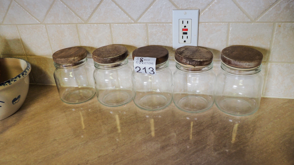 (6) Glass storage jars with wood tops (#213) Kelley Moving Auction