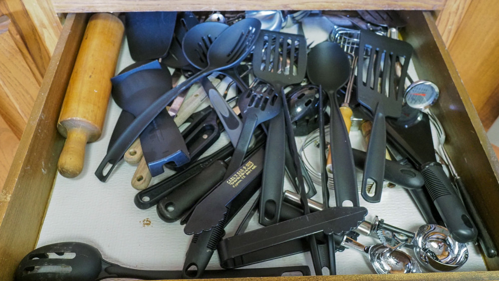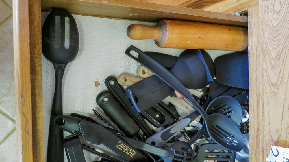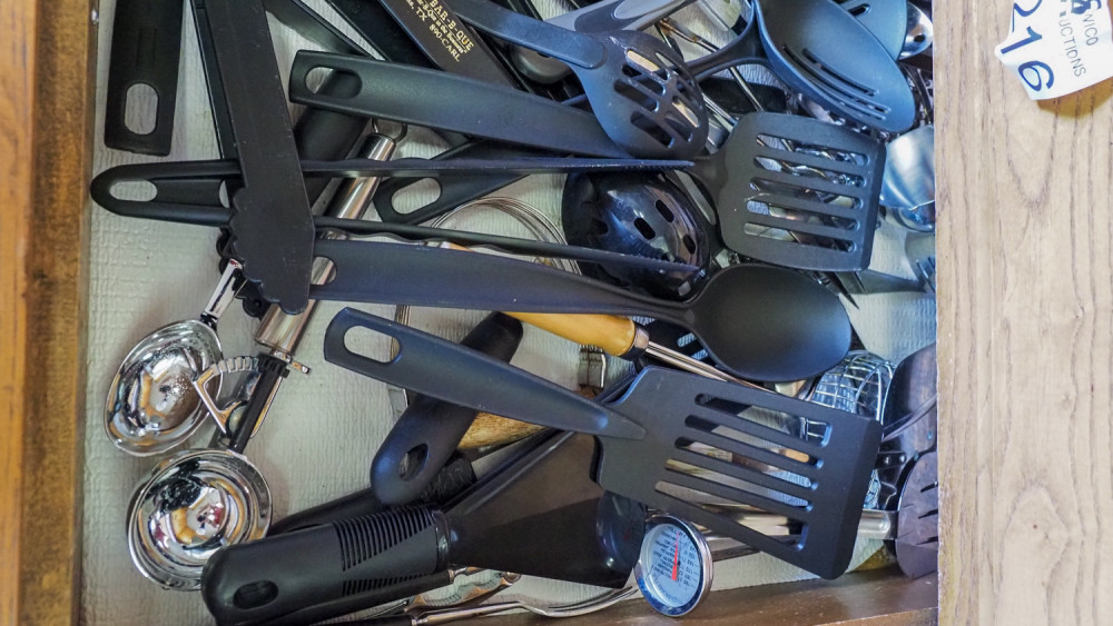 Drawer of serving utensils & rolling pin (#217) Kelley Moving Auction