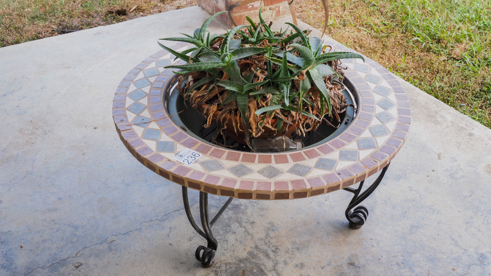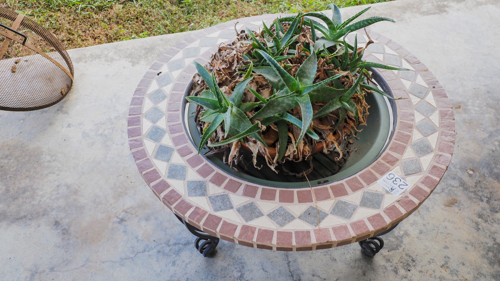 Mosaic-tile fire pit with aloe vera plant (#236) Kelley Moving Auction