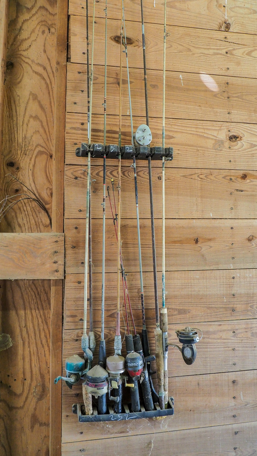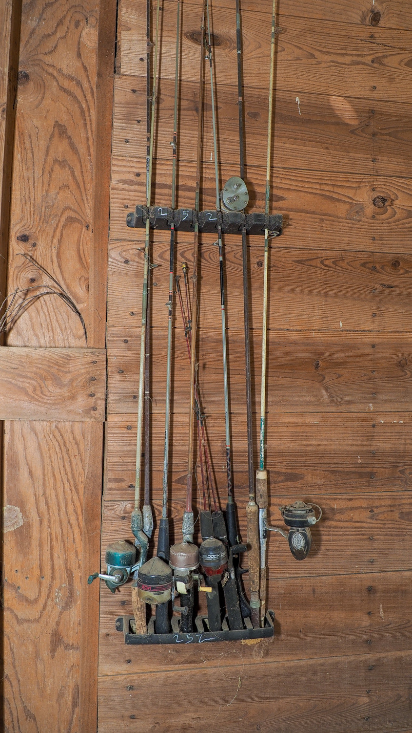 (9) poles (some with reels) plus wall-mount rack