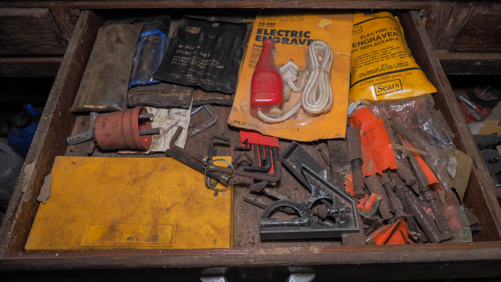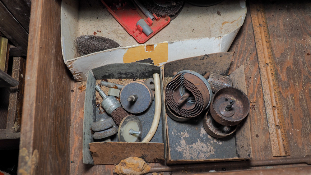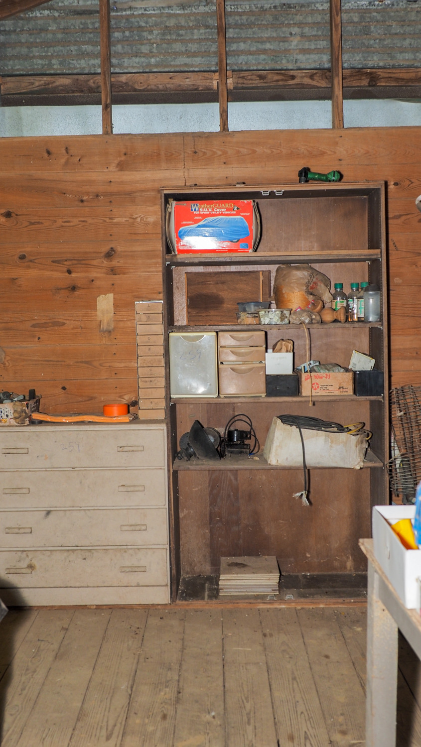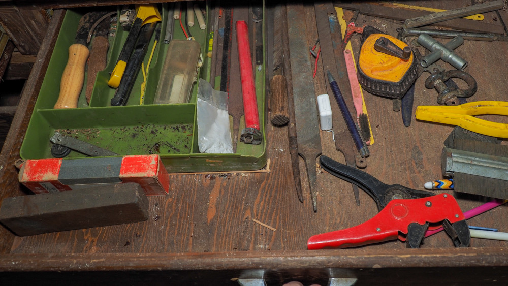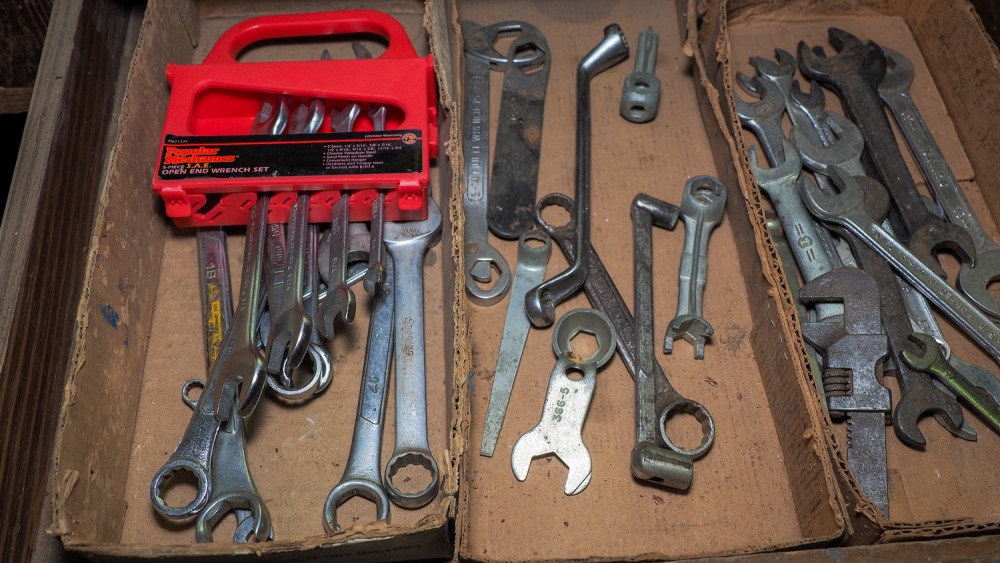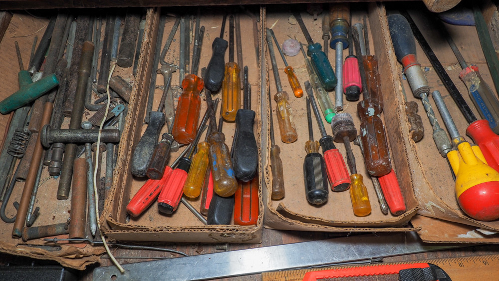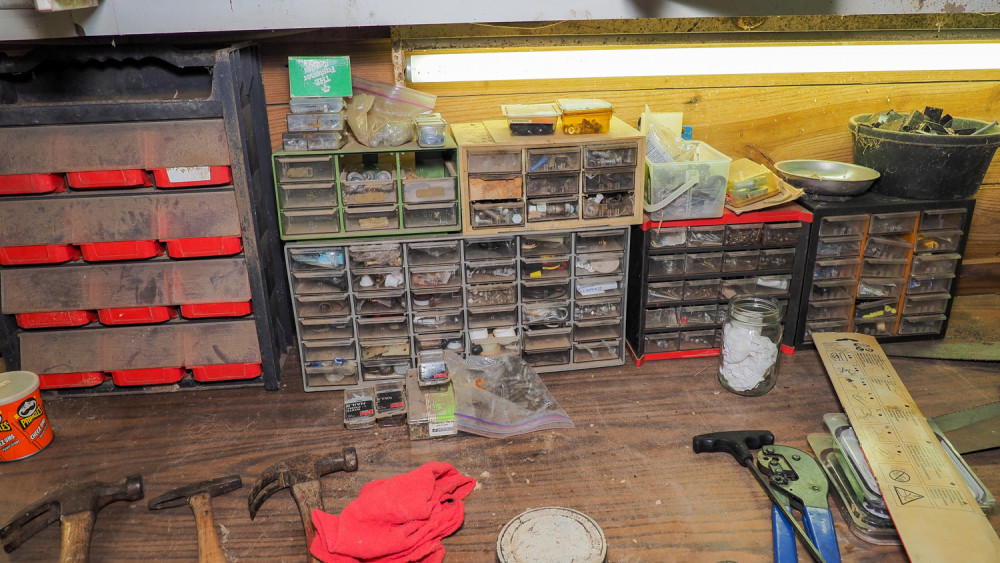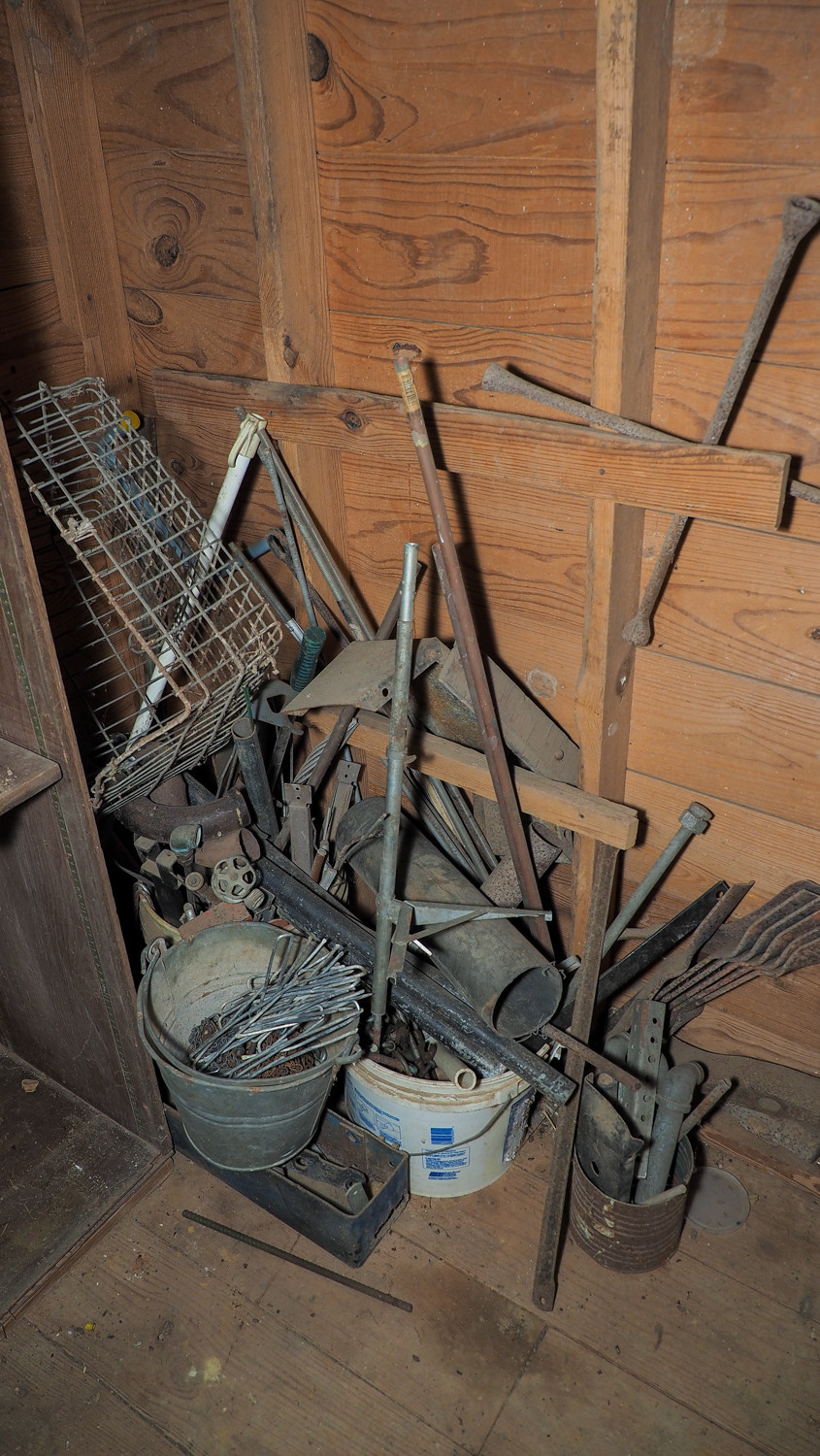 Hammers, tap-and-die sets, bike parts, pole saws, plumbing parts, hardware, saws, painting and electrical supplies, metal scrap, (2) wood cabinets, metal cabinet, screwdrivers, pliers, wrenches and funnels