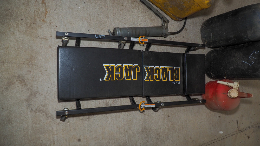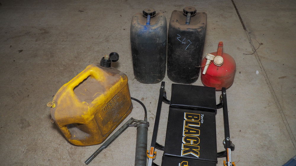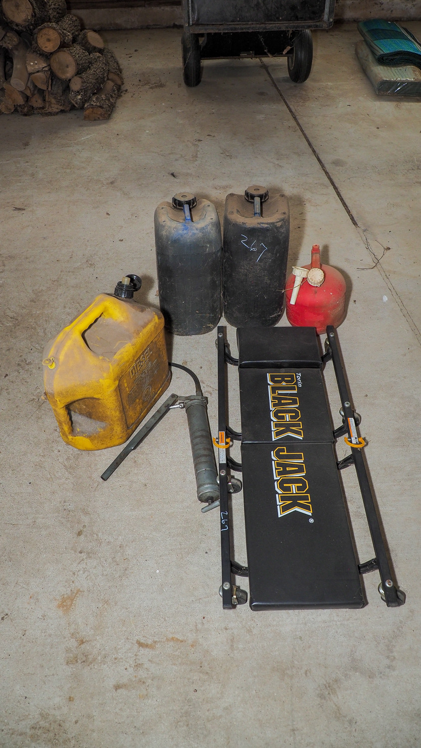 Jack, mechanic’s creeper, grease gun, 5-gal diesel can, 1-gal gas can, (2) oil canisters
