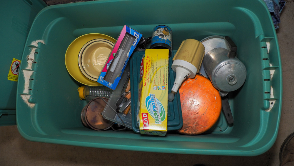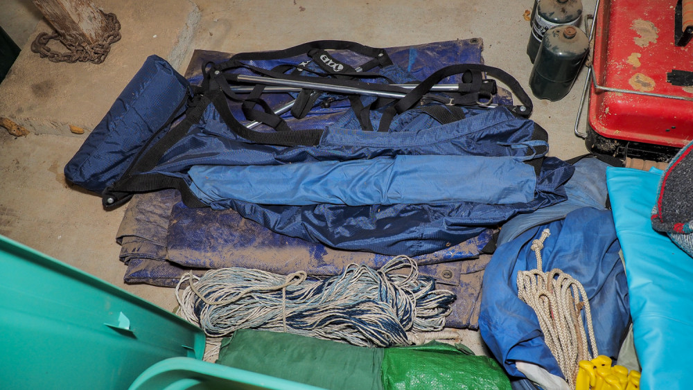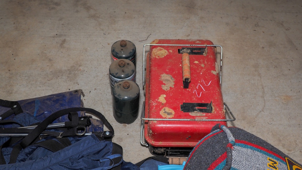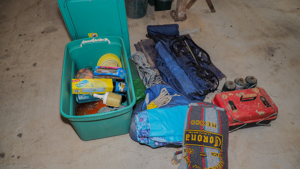 Charcoal stove, propane bottles, hanging chairs, tarps, tents, plates, bowls, coffee makers, skillets, utensils and more