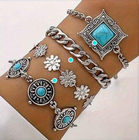 4pcs Vintage Women Bracelets Set Bohemian Silvery Inlaid Geometry Turquoise Chain