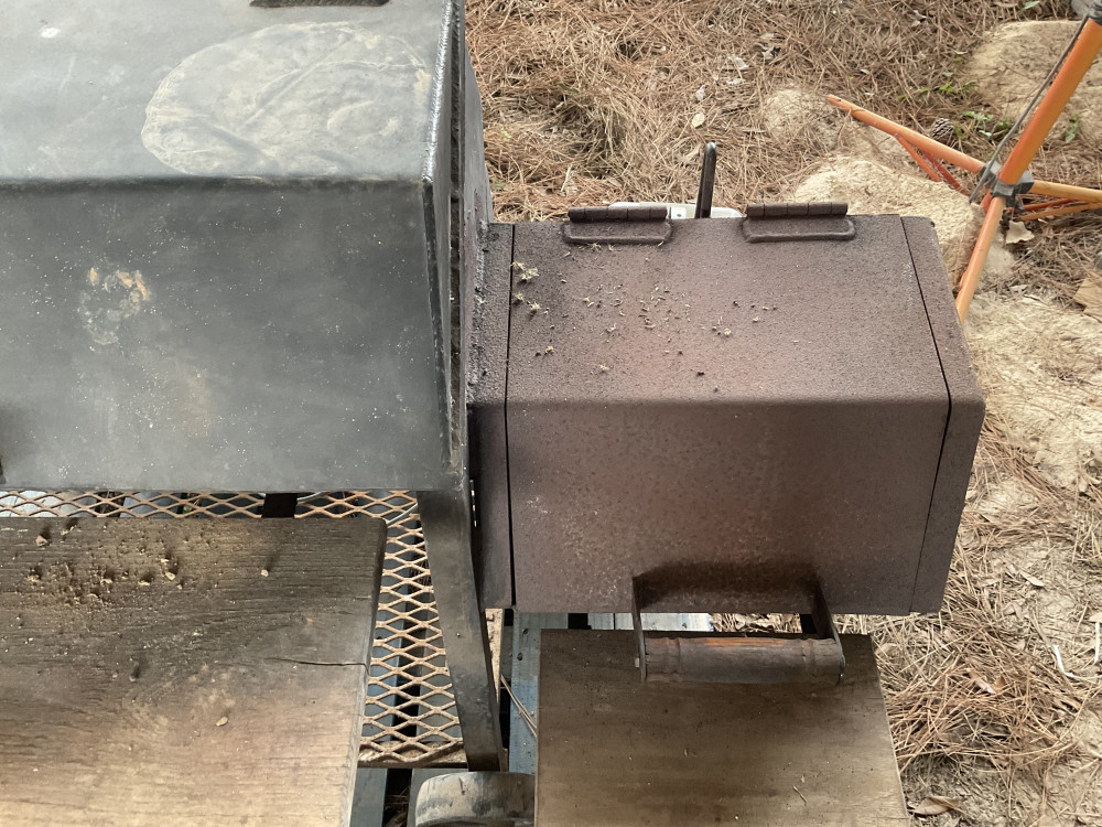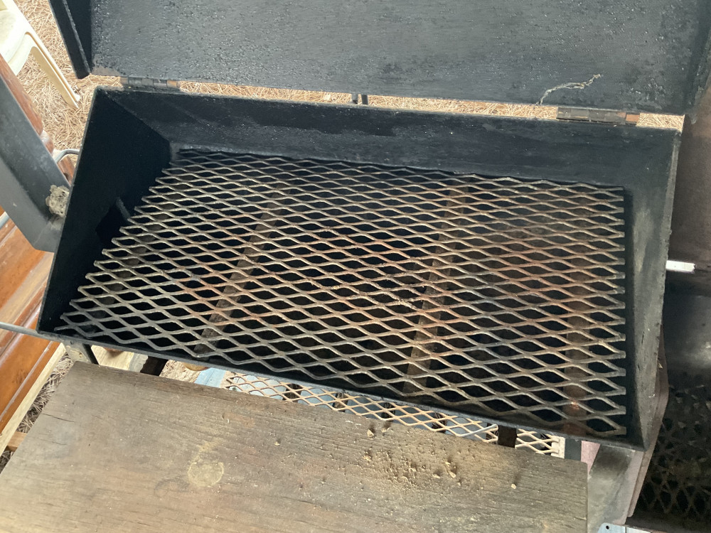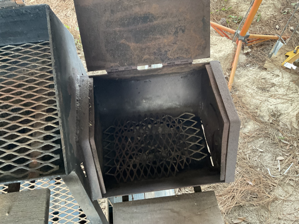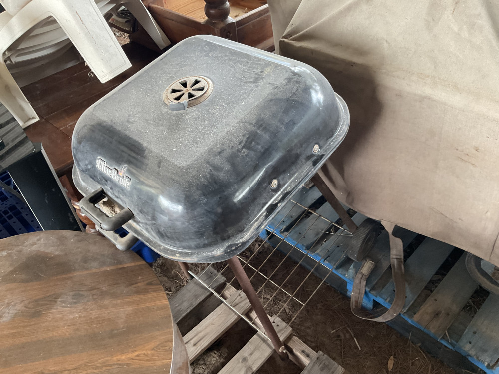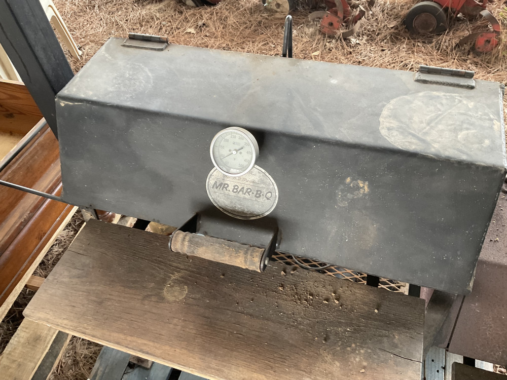 One is a charbroil clamshell pit on four legs. The other is a Mr Bar-b-q heavy metal pit on wheels with a side attached firebox. It has a cover with it that has a few holes in it but is still intact. Very good condition.