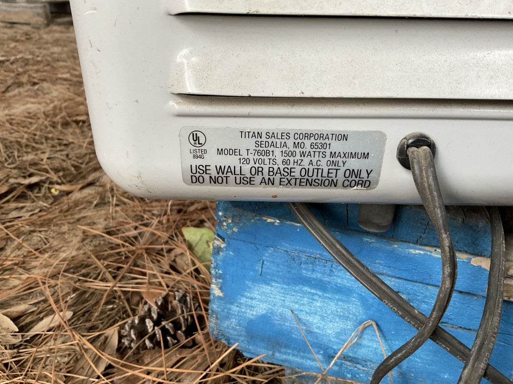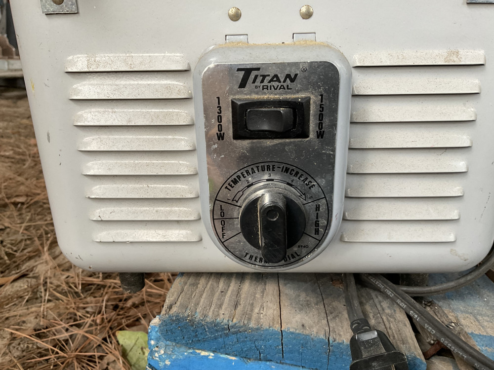 Titan by Rival milkhouse heater, 110v, will switch between 1300 watts and 1500 watts. Working unit.