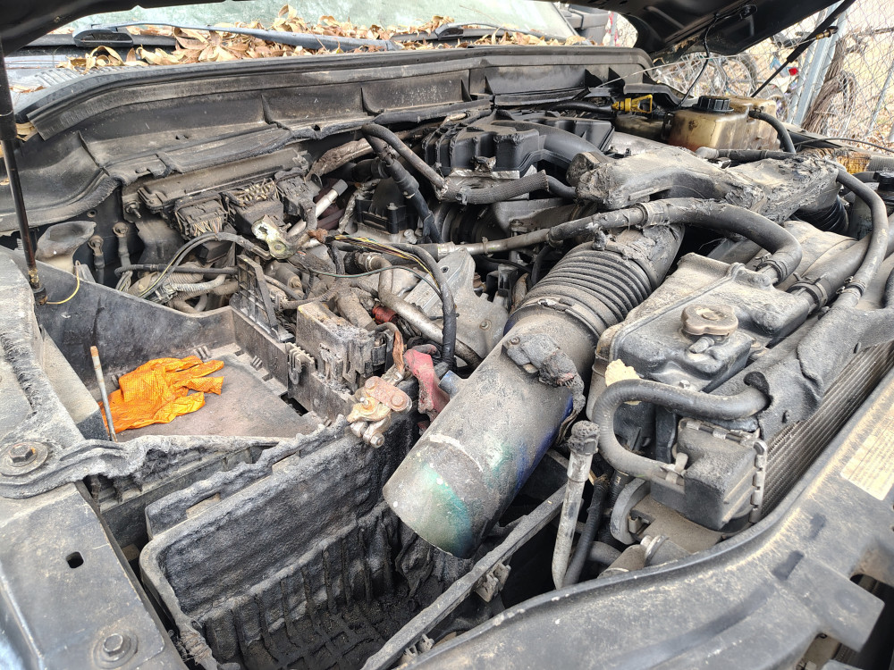 Mechanical: Engine will not turnover or start, appears to have fire damage under the hood, unknown cause/condition.
