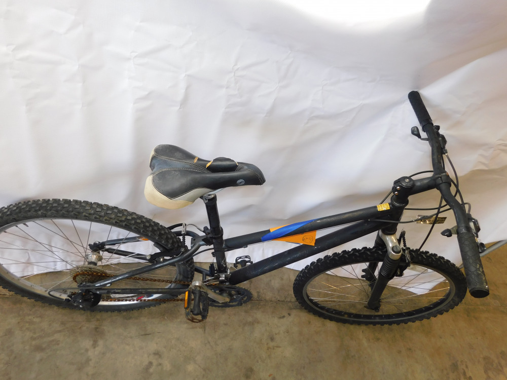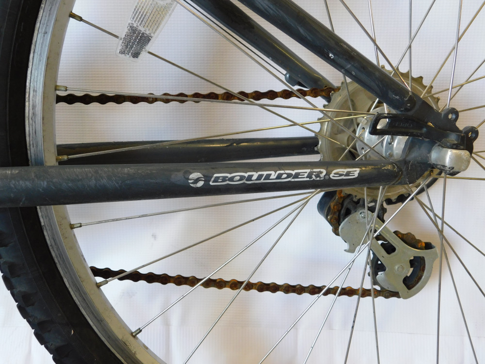Boulder SE Mountain Bike - 24 Speed, rust on chain, paint wear all around, flat rear tire.