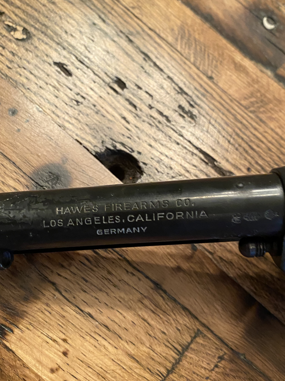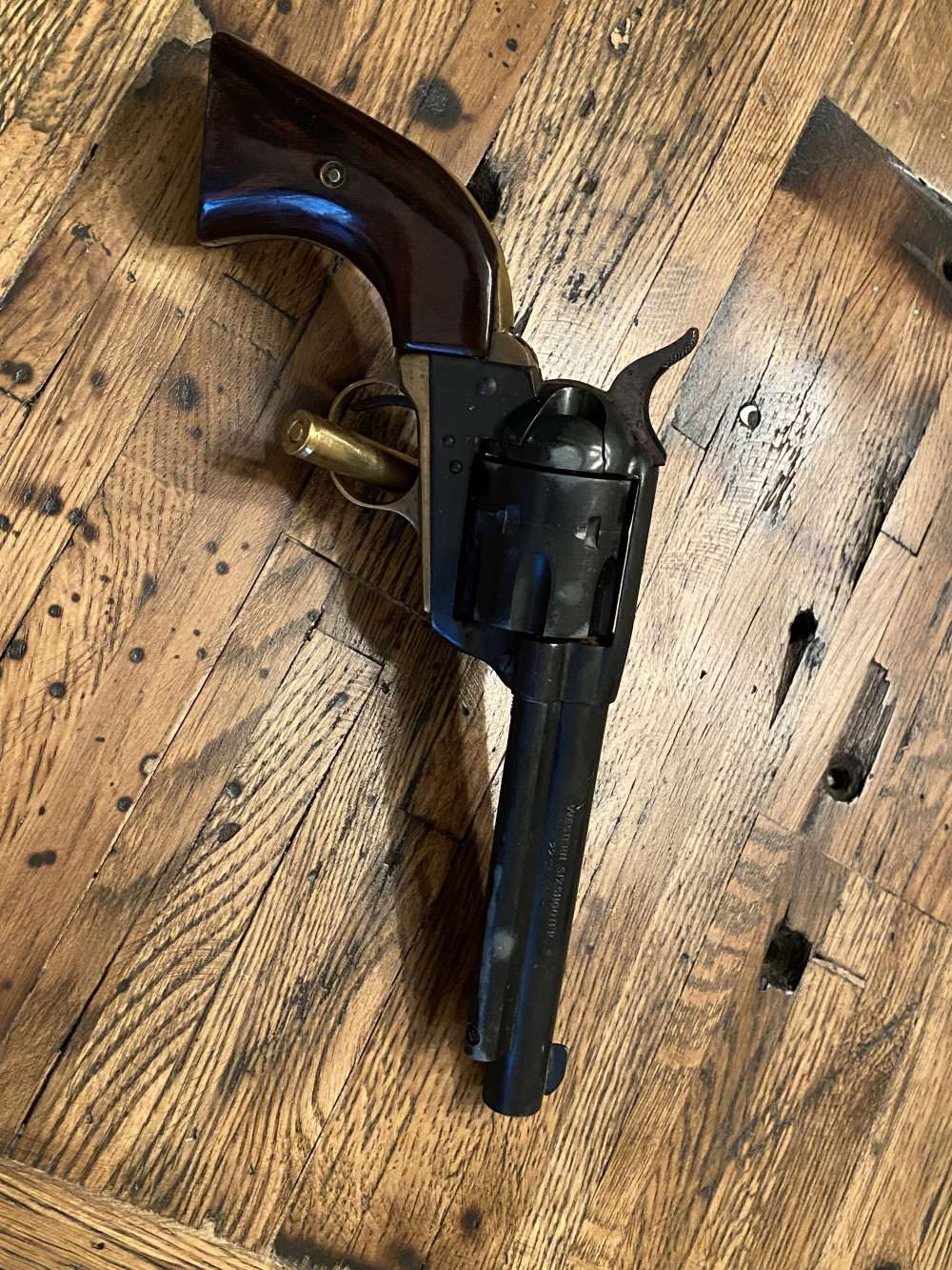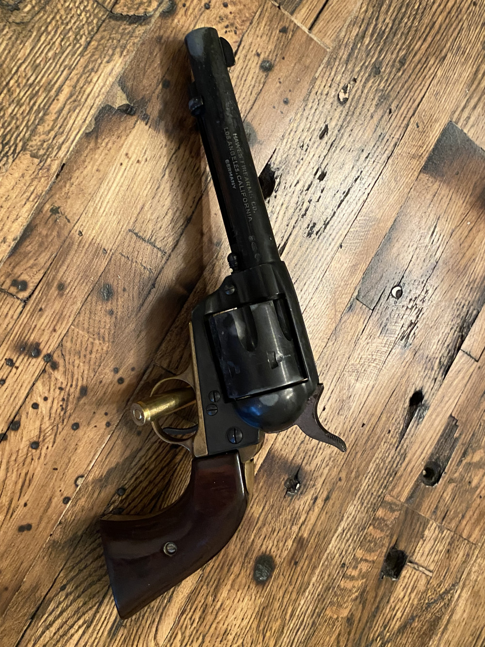 This is a circa 1980 Hawes Western Six Shooter in 22 Long Rifle. The pistol was manufactured by J.P. Sauer & Sohn of Germany and imported by the Hawes Firearms (no longer in business). Modeled after the famed Colt peacemaker making this single action revolver reliable.
