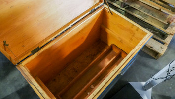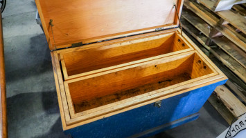 Is a blue wood storage box measures 20 x 35 x 21 inches Includes wood organizing trays *The University of Texas at Austin makes no claim of physical or mechanical condition, and functionality of items available through SWICO Auctions. All items are sold “As is, where is”. It is the sole responsibility of the bidder to physically inspect items before bidding and assume all risk. Photos and descriptions are for preview only. All sales are final and no refunds will be issued. Please refer to the SWICO “Terms of Service” in which you have agreed to.