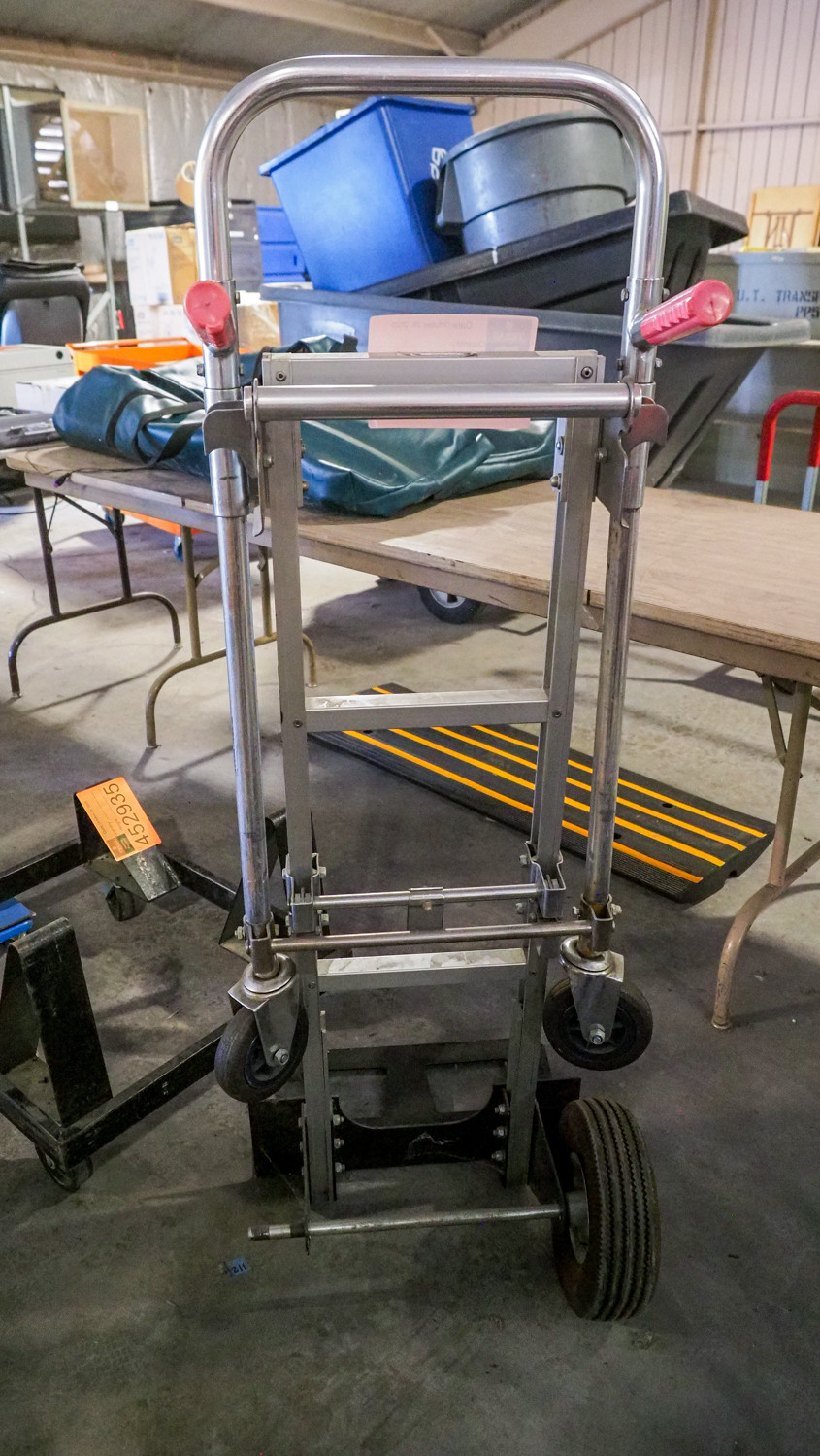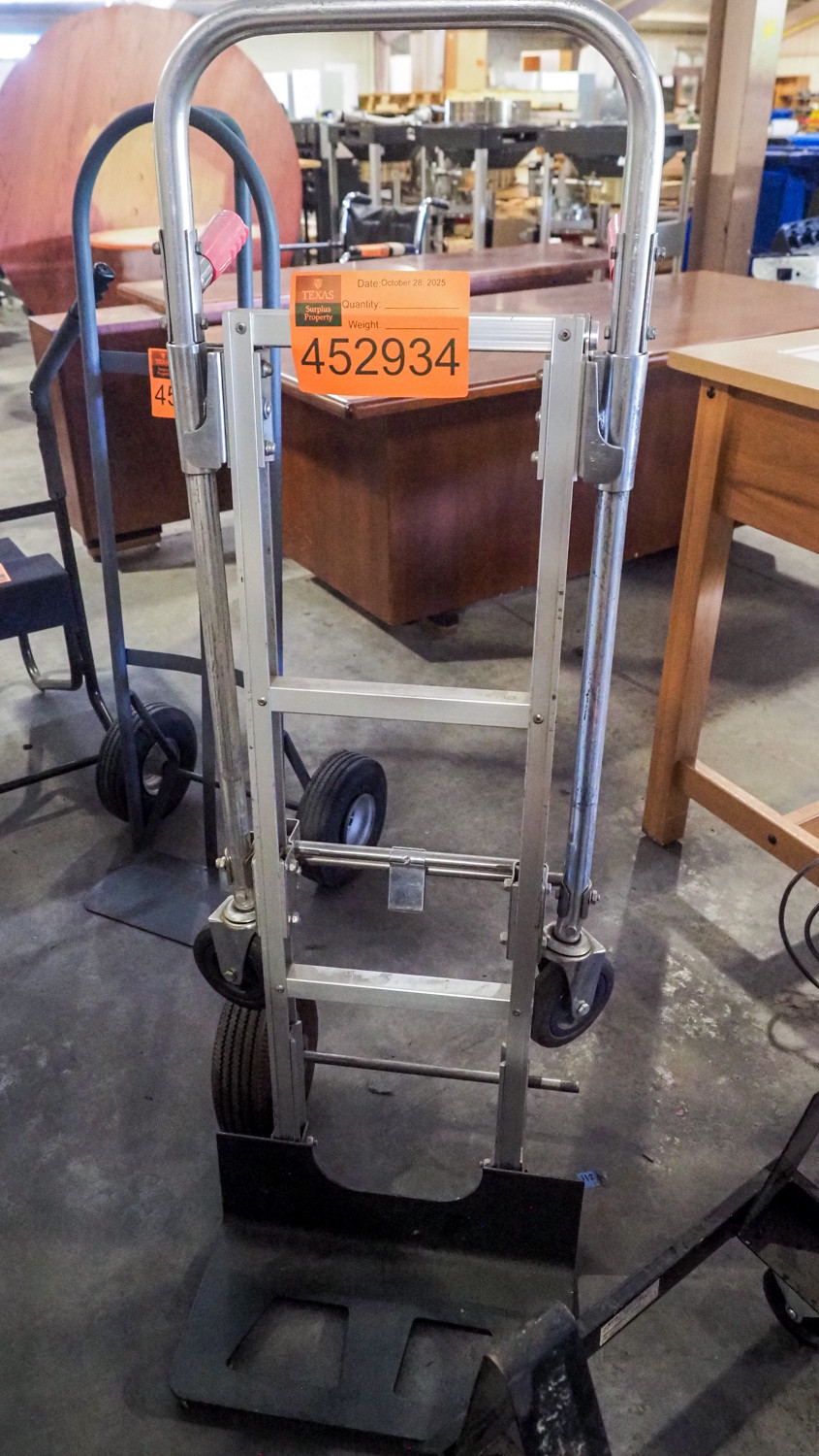 Aluminum convertible Dolly. Missing one wheel and the other wheel is flat *The University of Texas at Austin makes no claim of physical or mechanical condition, and functionality of items available through SWICO Auctions. All items are sold “As is, where is”. It is the sole responsibility of the bidder to physically inspect items before bidding and assume all risk. Photos and descriptions are for preview only. All sales are final and no refunds will be issued. Please refer to the SWICO “Terms of Service” in which you have agreed to.