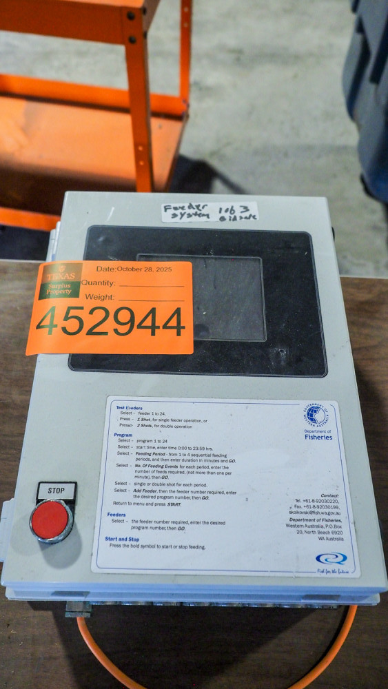 is a Fish feeder system control panel *The University of Texas at Austin makes no claim of physical or mechanical condition, and functionality of items available through SWICO Auctions. All items are sold “As is, where is”. It is the sole responsibility of the bidder to physically inspect items before bidding and assume all risk. Photos and descriptions are for preview only. All sales are final and no refunds will be issued. Please refer to the SWICO “Terms of Service” in which you have agreed to.