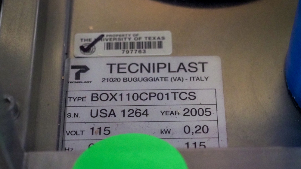 Tecniplast slim touch technolast blower, type: BOX 110 CP01 TCS, Built in 2005, 115 volt Condition:Condition unknown, but looks in good shape *The University of Texas at Austin makes no claim of physical or mechanical condition, and functionality of items available through SWICO Auctions. All items are sold “As is, where is”. It is the sole responsibility of the bidder to physically inspect items before bidding and assume all risk. Photos and descriptions are for preview only. All sales are final and no refunds will be issued. Please refer to the SWICO “Terms of Service” in which you have agreed to.