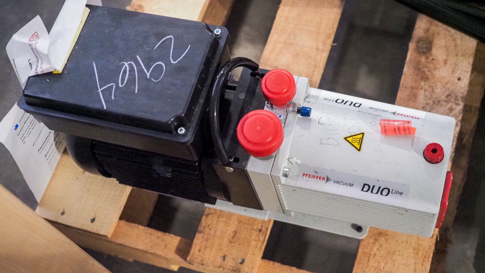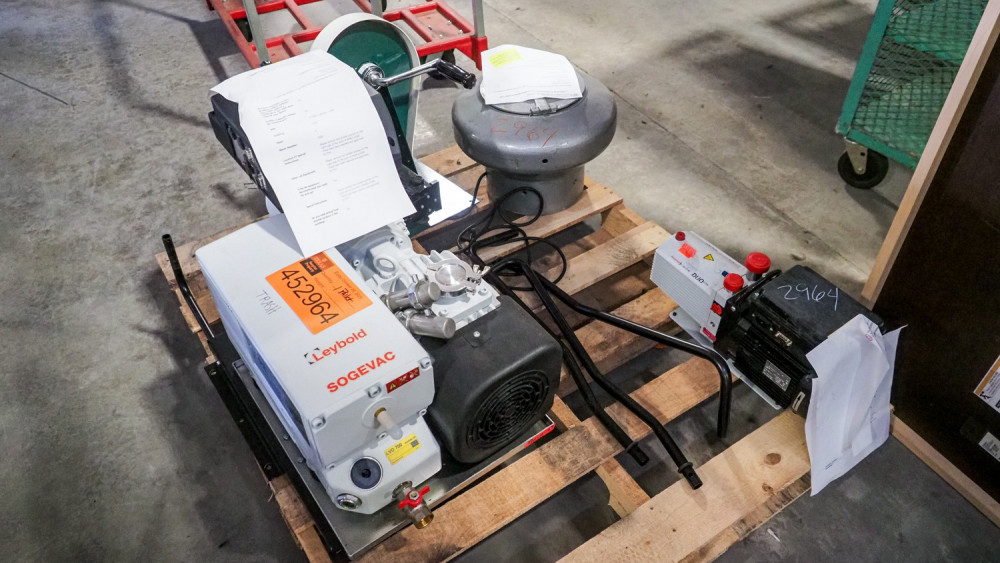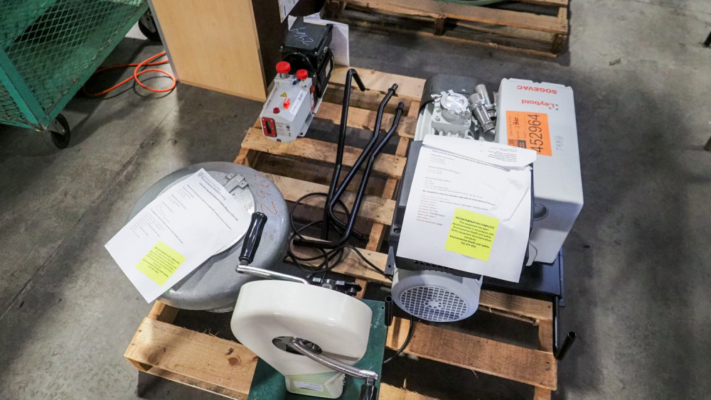 pallet of lab equipment includes LEYBOLD SOGEVAC Vacuum pump, Pfeiffer vacuum, duo line vacuum pump, Clay Adams Safeguard lcinical Centrifuge, and a hand crank Test device Condition:Condition is on both vacuum pumps is non-working *The University of Texas at Austin makes no claim of physical or mechanical condition, and functionality of items available through SWICO Auctions. All items are sold “As is, where is”. It is the sole responsibility of the bidder to physically inspect items before bidding and assume all risk. Photos and descriptions are for preview only. All sales are final and no refunds will be issued. Please refer to the SWICO “Terms of Service” in which you have agreed to.