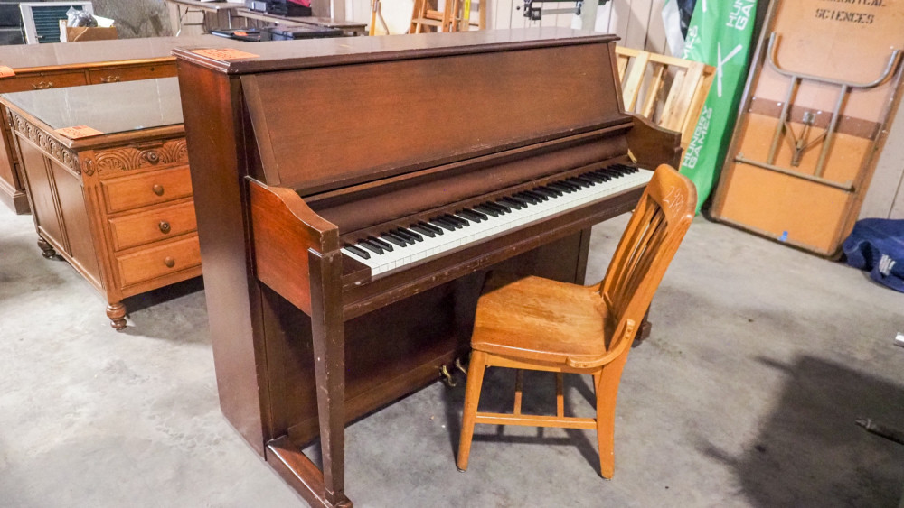 Appears to have been last tuned in 2022 Also includes an oak curved brace chair *The University of Texas at Austin makes no claim of physical or mechanical condition, and functionality of items available through SWICO Auctions. All items are sold “As is, where is”. It is the sole responsibility of the bidder to physically inspect items before bidding and assume all risk. Photos and descriptions are for preview only. All sales are final and no refunds will be issued. Please refer to the SWICO “Terms of Service” in which you have agreed to.