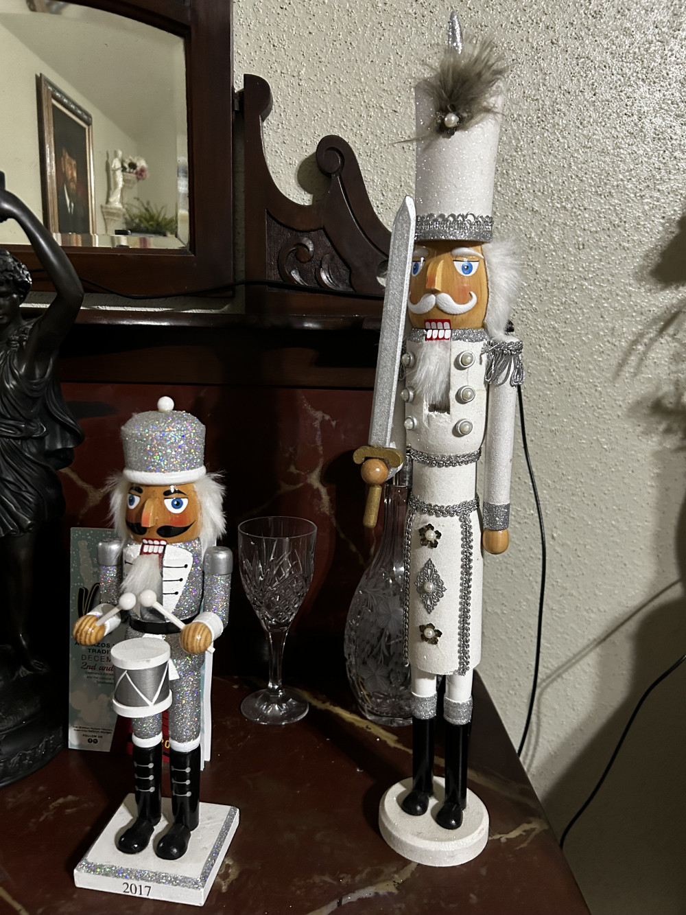 Two tall and two short nutcrackers, in gray/silver/white. Measurements are in the photos. Like new.