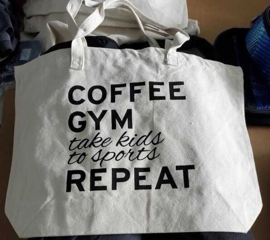 Qty of 2 CANVAS TOTE BAG COFFEE GYM KIDS REPEAT Great Deals and Steal