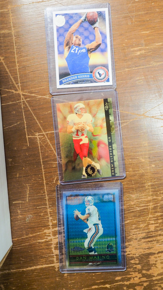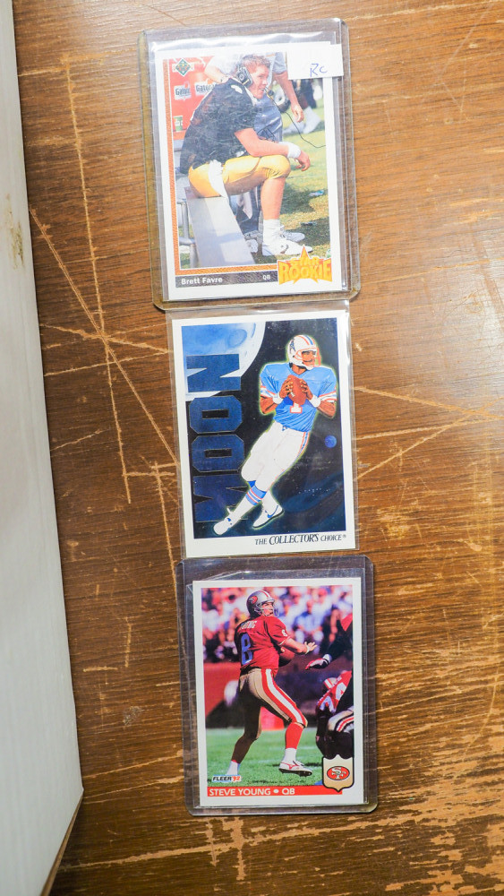 Lot includes on box of 1998 cards. you have Absolute, Topps, Metal Universe, Bowman, Stadium Club and others. Players include Drew Bledsoe, Eddie George, Ahman Green, Keyshawn Johnson, Steve McNair and more. 2nd box is 1991 cards from Upper Deck with Brett Faver, Michael Irvin, Ray Childress, and others, Edge 1999 Payton Manning, 2006 Mario Williams, 1999 Upper Deck Emmitt Smith, 1992 Steve Young, 1995 Marshall Faulk, and more