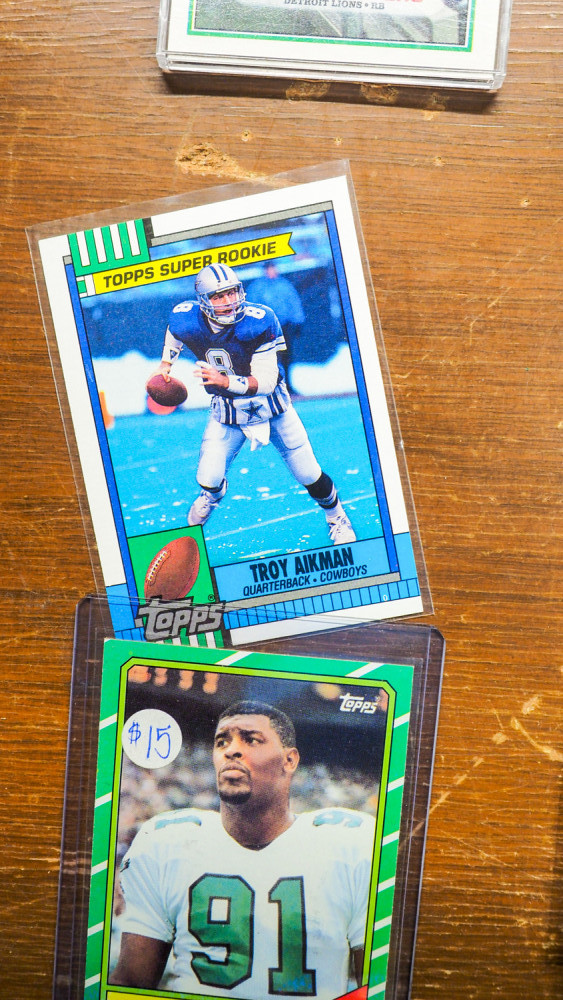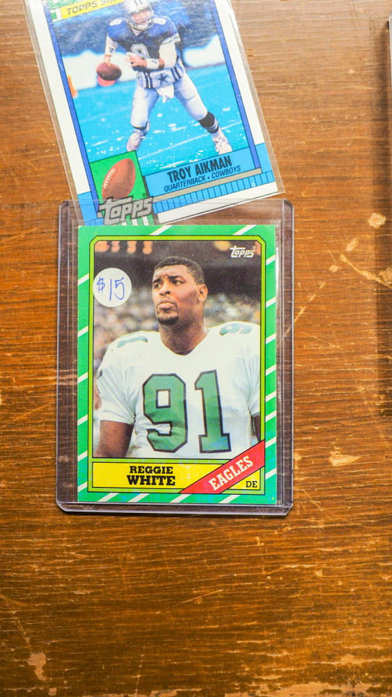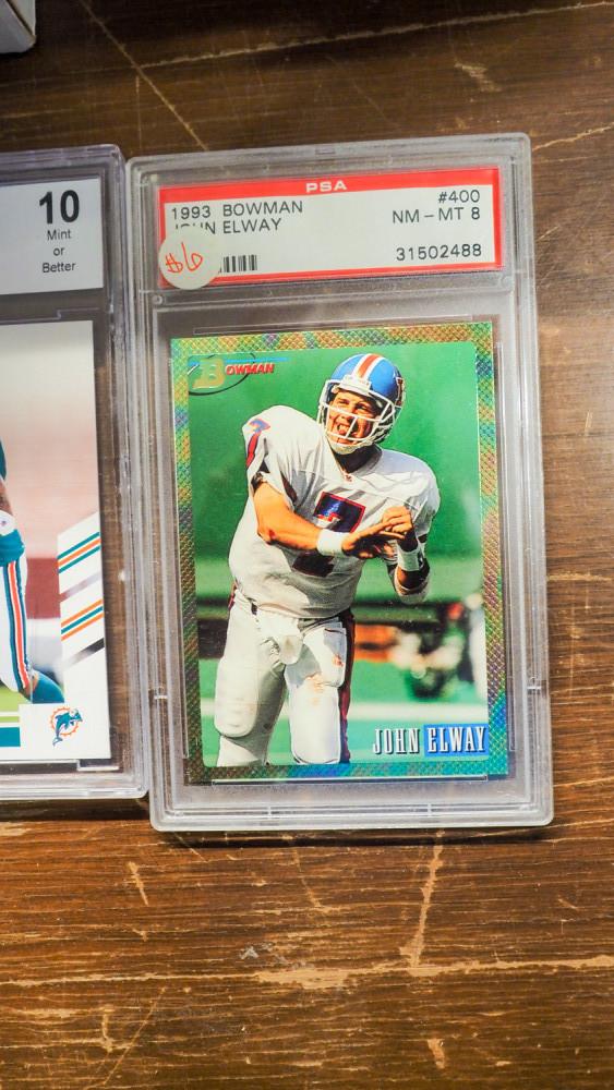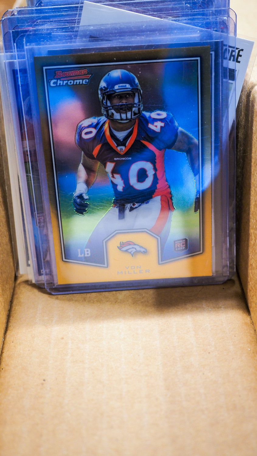 Box includes a 1993 NM-MT 8 Bowman John Elway, a 2007 Mint 10 Ted Ginn Jr, a 2000 Donruss Mint 9 Ryan Leaf. Also in the box are Von Miller Rookie cards, Randal Cobb Rookie Cards, Dez Brylant Rookie card, Rob Gronkowski Rookie Cards, 2002 Donruss Classic cards - Drew Brees, Payton Manning, Brett Faver and others, 2001 Donruss Elite - Emmitt Smith, Troy Aikman, 1997 Pinnacle Certified cards - Tiki Barber Rookie Card, Herschel Walker, Emmitt Smith, Warrick Dunn Rookie Card, and others, Aaron Books Rookie Cards, Barry Sanders, Reggie White, Walter Payton, Marshall Faulk Rookie Card, and many more