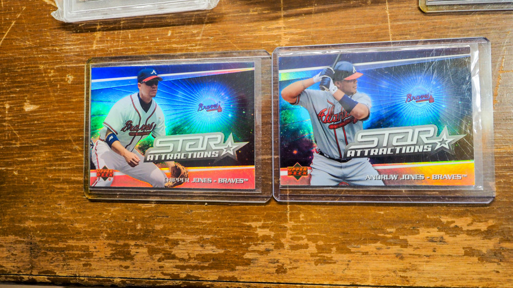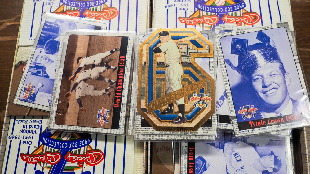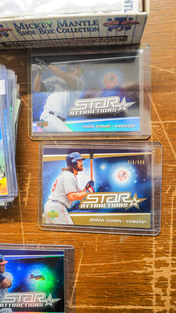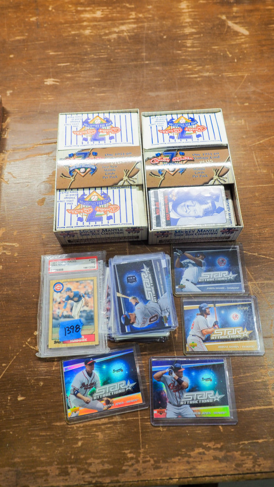 Lot includes PSA 1987 Topps Greg Madduz NM 7, Andrew Jones card, Chipper Jones, Justin Verlander Rookie card, 1987 All-Star card that include Gary Carter, Don Mattingly, Cal Ripken and others, one Mickey Mantle Shoe Box Collection box with opened cards in it and a second box with just wrappers from the cards.
