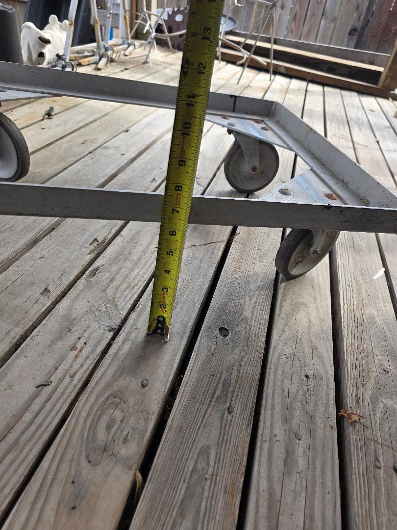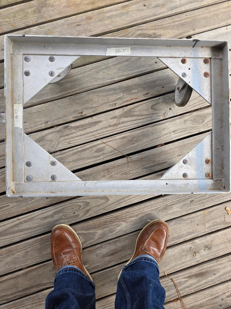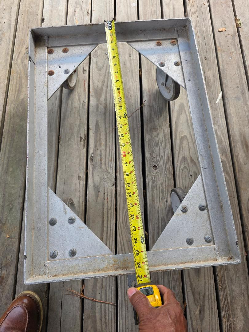 This is an aluminum dolly, handy for moving furniture and other household items. It is approximately 27.5 inches long, 18.5 inches wide and 7 inches tall.