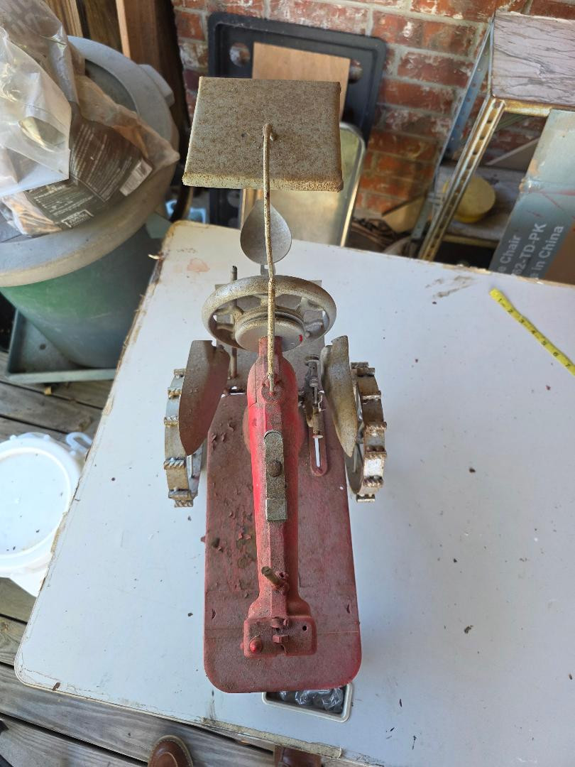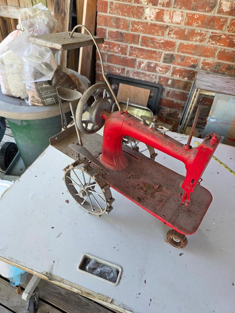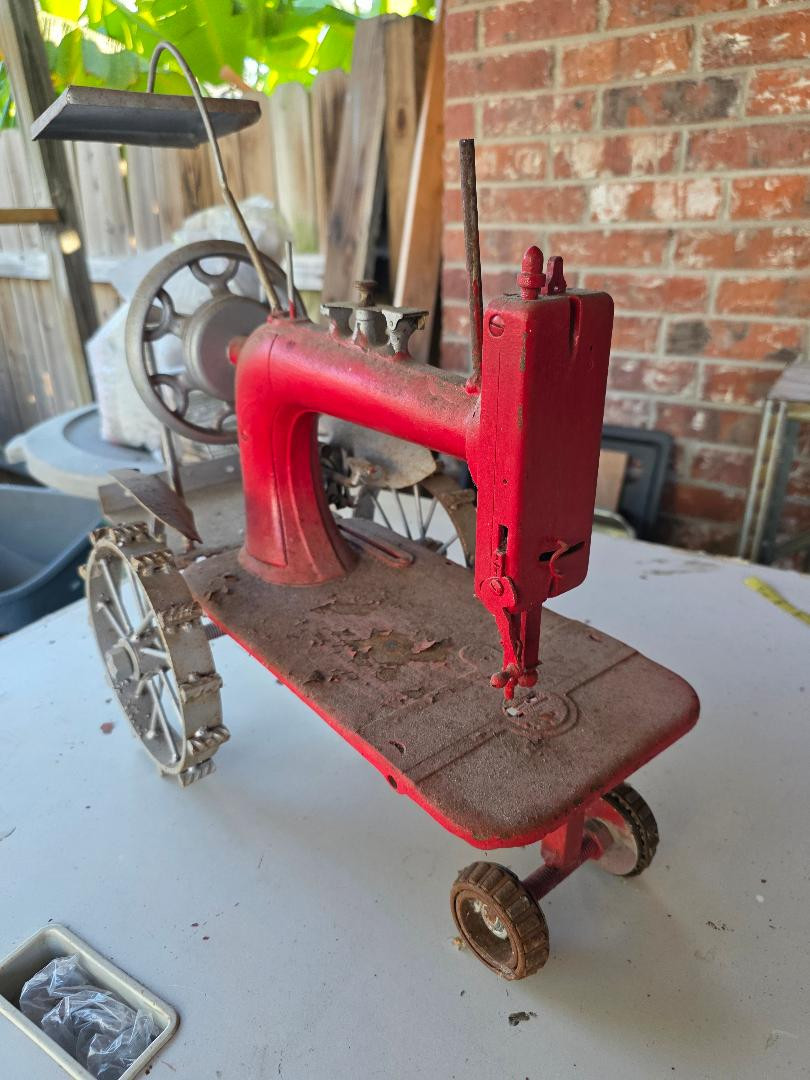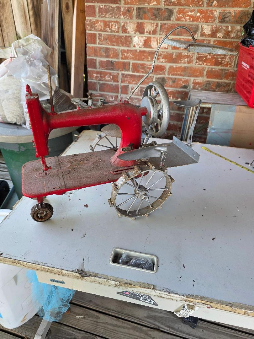 Grandma's old sewing machine found a new use. This is a sewing machine that has been converted to a tractor. All the wheels turn and with a little TLC will make an interesting conversation piece.