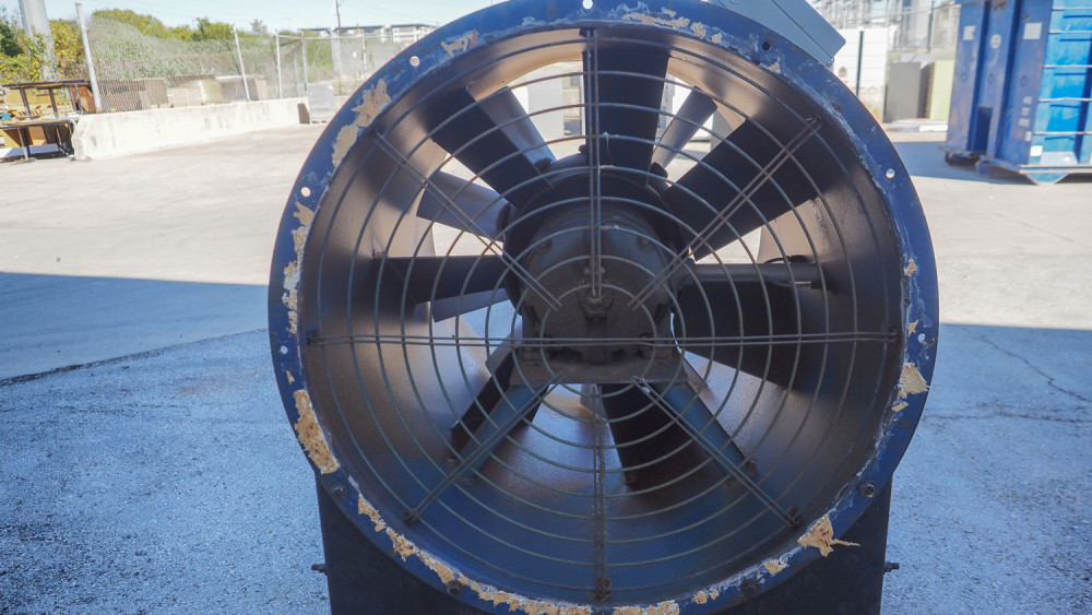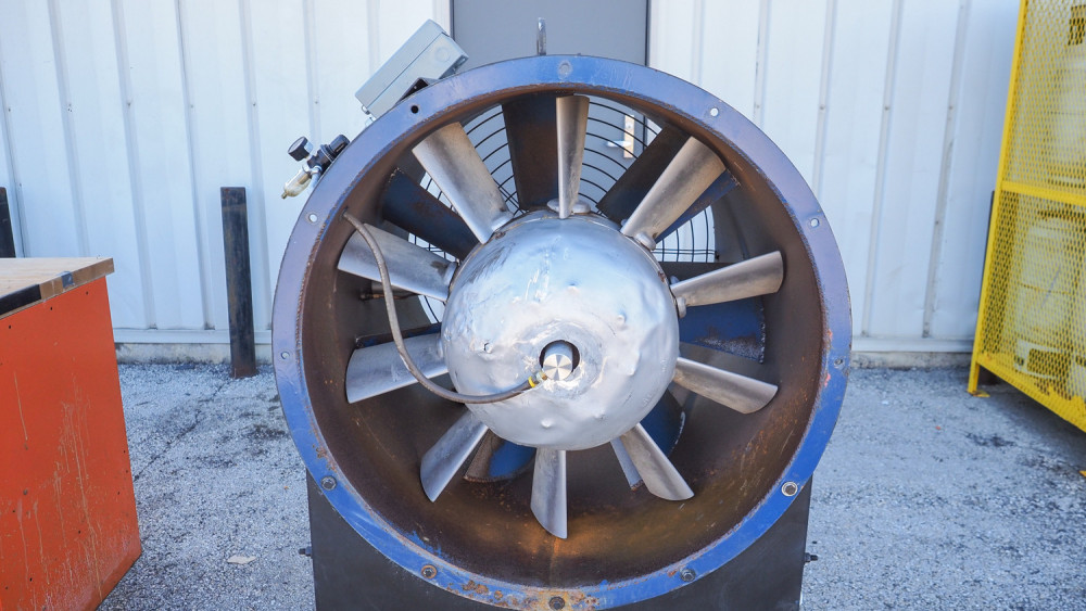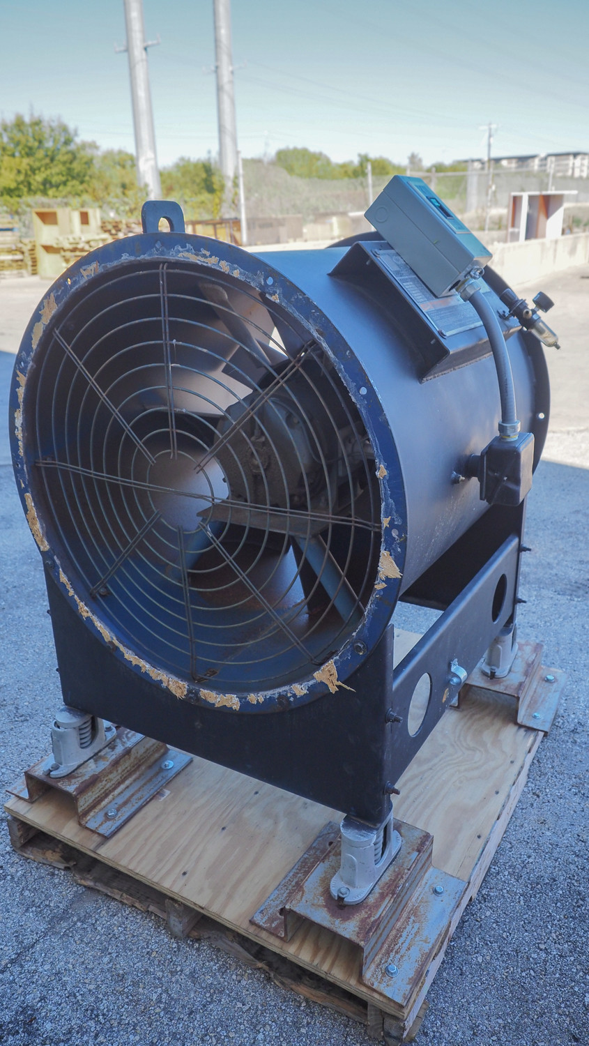 Champion industrial impeller fan, size 80-40-10; approx. 43.5" fan diameter; variable-pitch impeller; 3 HP 230/460V three-phase motor; rated approx. 9240 CFM at 1170 RPM. *The University of Texas at Austin makes no claim of physical or mechanical condition, and functionality of items available through SWICO Auctions. All items are sold “As is, where is”. It is the sole responsibility of the bidder to physically inspect items before bidding and assume all risk. Photos and descriptions are for preview only. All sales are final and no refunds will be issued. Please refer to the SWICO “Terms of Service” in which you have agreed to.